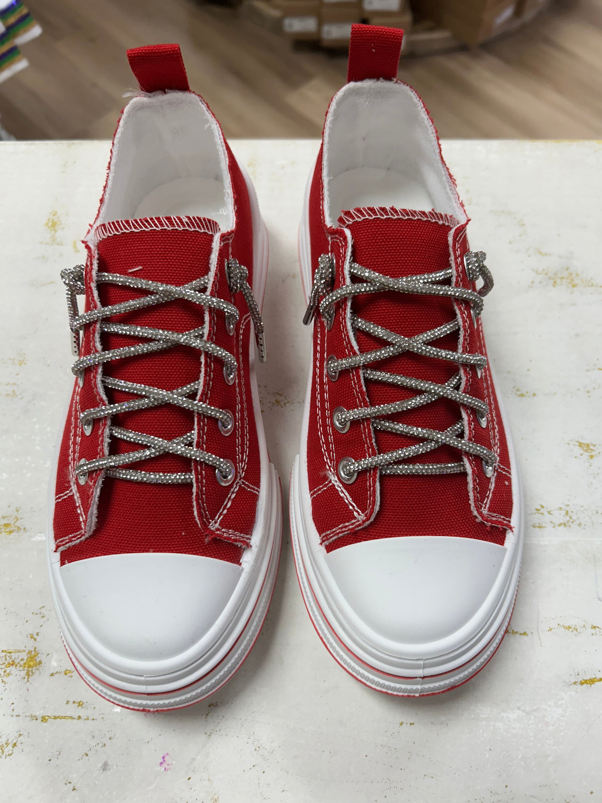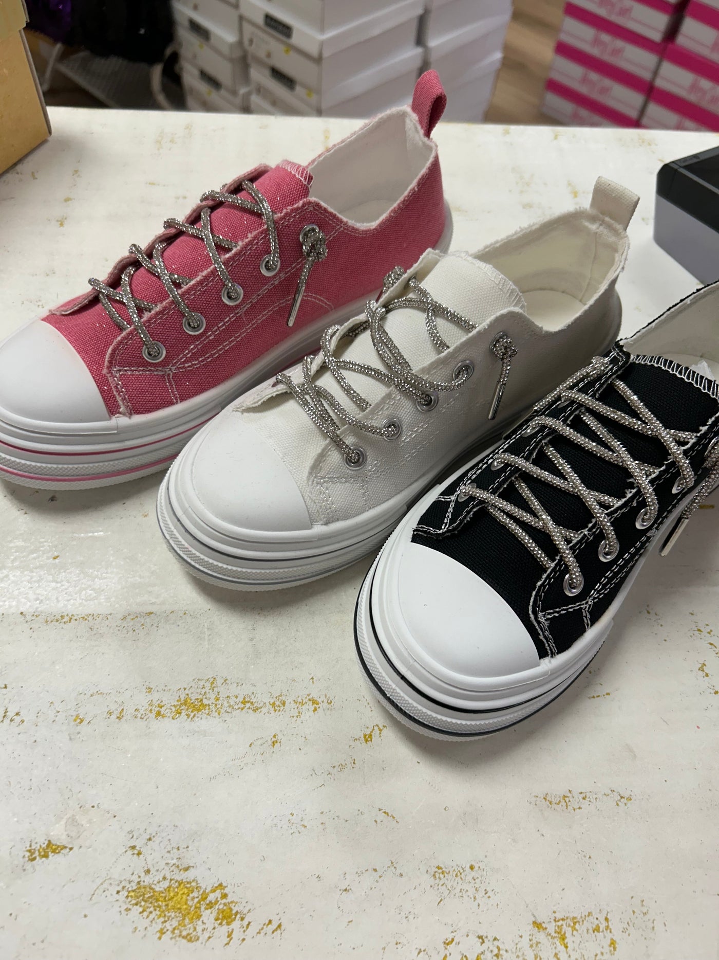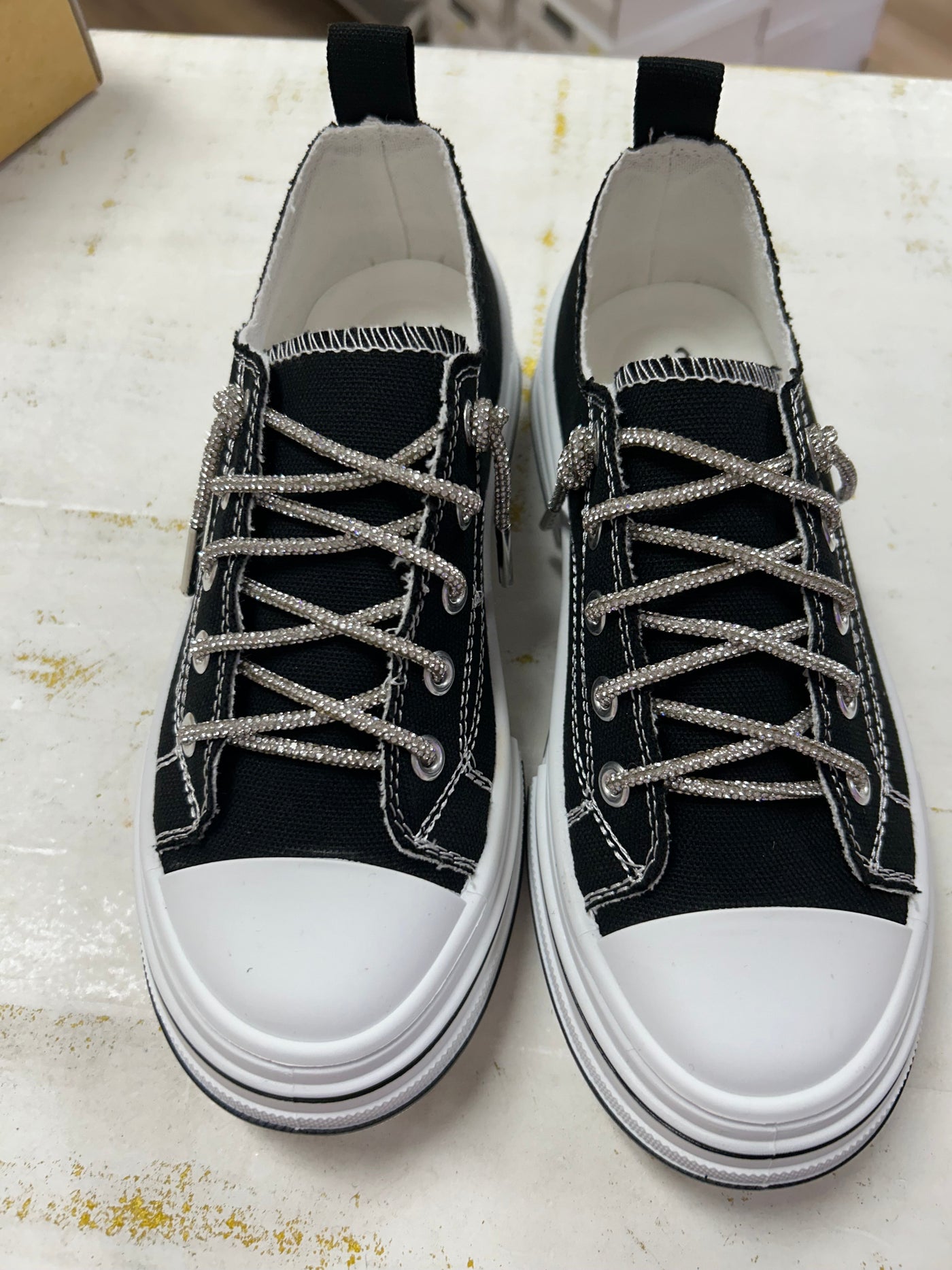 The Aman Rhinestone Lace up Tennis shoe is a standout crowd favorite with its platform sole and canvas construction. The rhinestone laces add a touch of glitz and glamour, making you stand out in the crowd. With a pop of shimmer and sparkle, this shoe is sure to impress. Expertly designed for both style and performance.