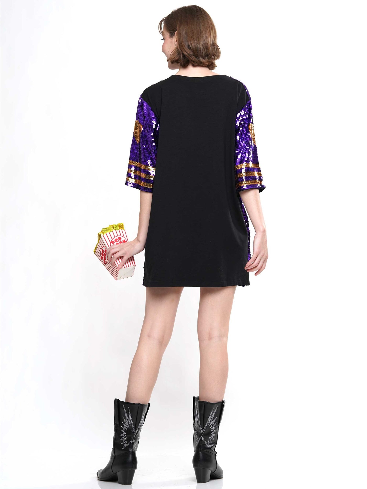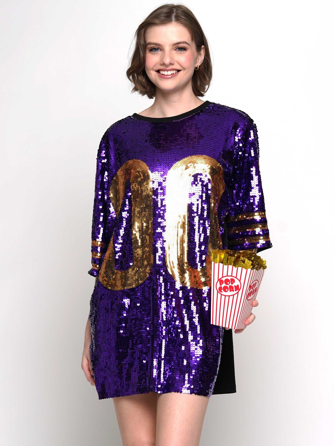 Discover the perfect blend of comfort and style with our Double Zero Sequin T-shirt Dress. This purple dress features gold sequin details on chest and on the sleeves for a touch of sparkle. With a fully lined interior and a T-shirt material back, you'll feel comfortable and fashionable all day long.