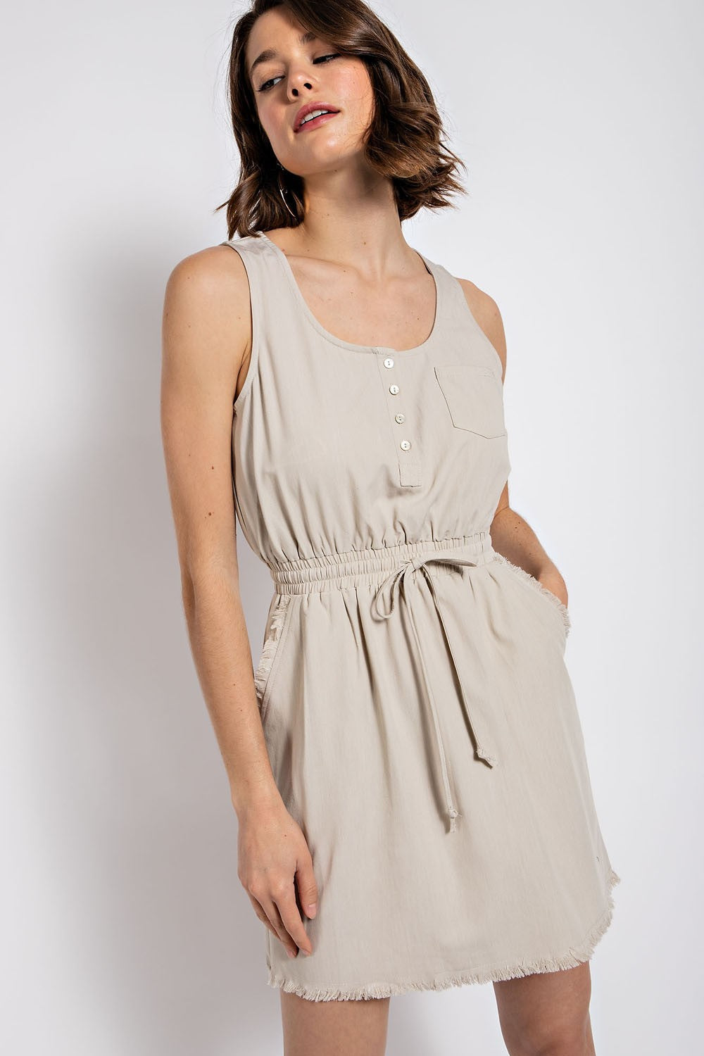 This sleeveless sand colored lightweight dress features a frayed hem and drawstring waist that makes it effortless chic. Fully functional buttons at chest for adjustability with front pockets for style and functionality.