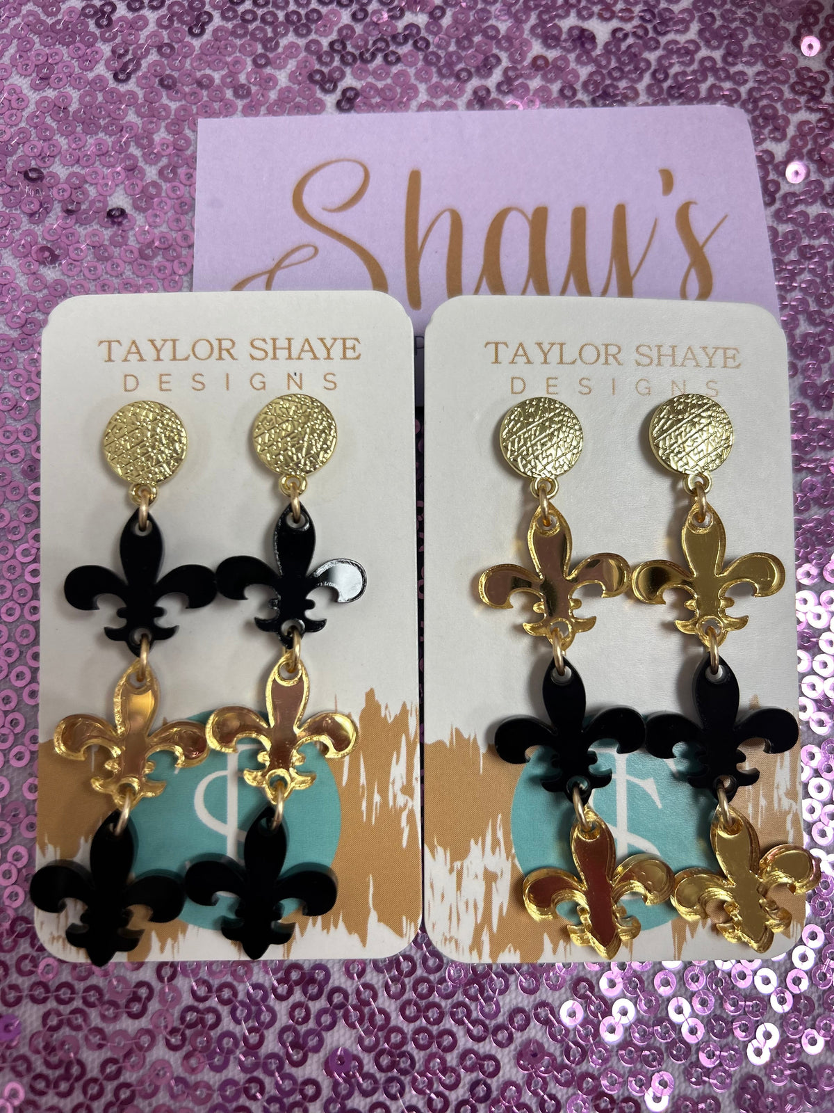 Elevate your game day look with our Taylor Shaye Acrylic Fleur De Lis Earrings. These stunning black and gold earrings feature intricate Fleur de lis designs, adding a touch of elegance to your outfit. Hand-crafted with precision, these earrings are perfect for showing off your team spirit in style.