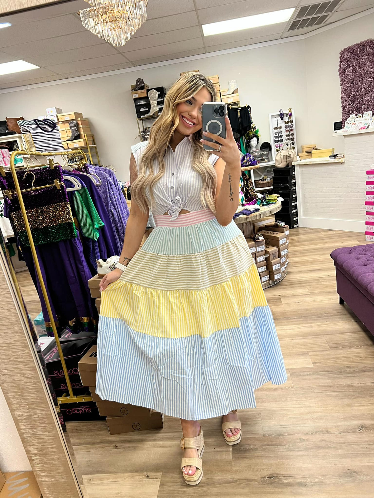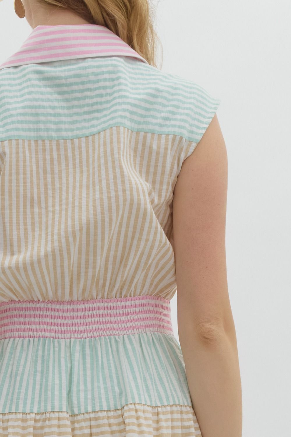 Off shoulder sleeveless midi dress featuring tiered striped colorblock. Collar with button and front tie closure. Elasticated smocked waistband at back. Pockets at side. Lined. Woven. Non-sheer. Lightweight.