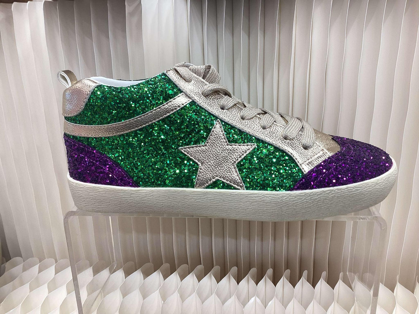 Introducing the Daisy-Mardi Gras Glitter High Top, the perfect sneaker for adding some fun and sparkle to your wardrobe. Embrace the festive spirit with these high top sneakers, complete with Mardi Gras inspired glitter detail. Elevate your style and shine bright in every step.