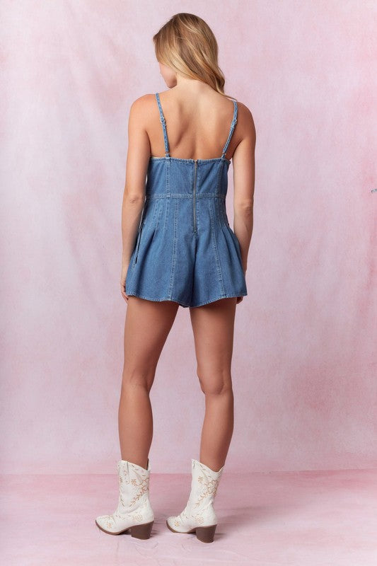Crafted from soft denim, our Scallop Trim Bow Detail Romper will have you stepping out in style and comfort. The bow detail trimmed in scallop adds a unique touch to this versatile piece, perfect for dressing up or down. Expertly designed for both fashion and ease. Fully adjustable spaghetti straps for perfect fit! Zipper with hook and eye closure.