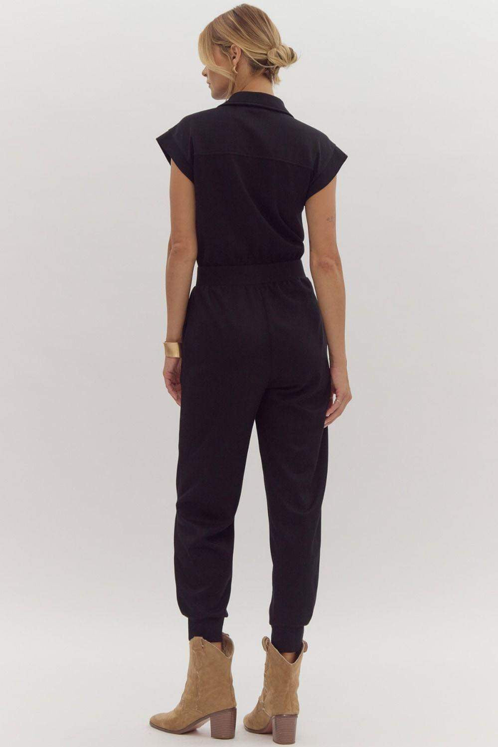 Solid sleeveless drop shoulder jumpsuit featuring front zipper closure under collared neck and elastic waistband. Side pockets. Unlined. Knit. Non-sheer. Midweight. The softest material you’ll feel!