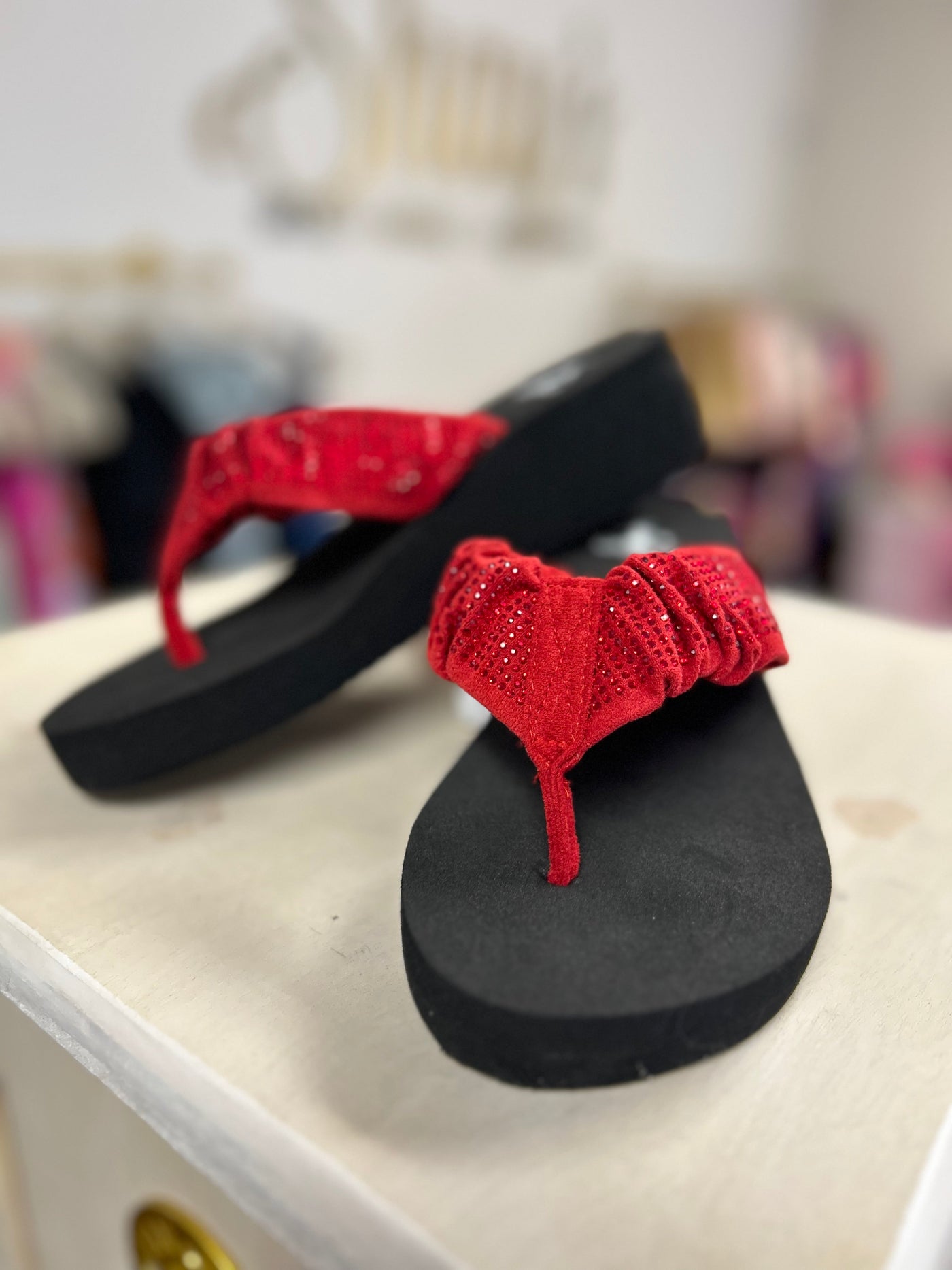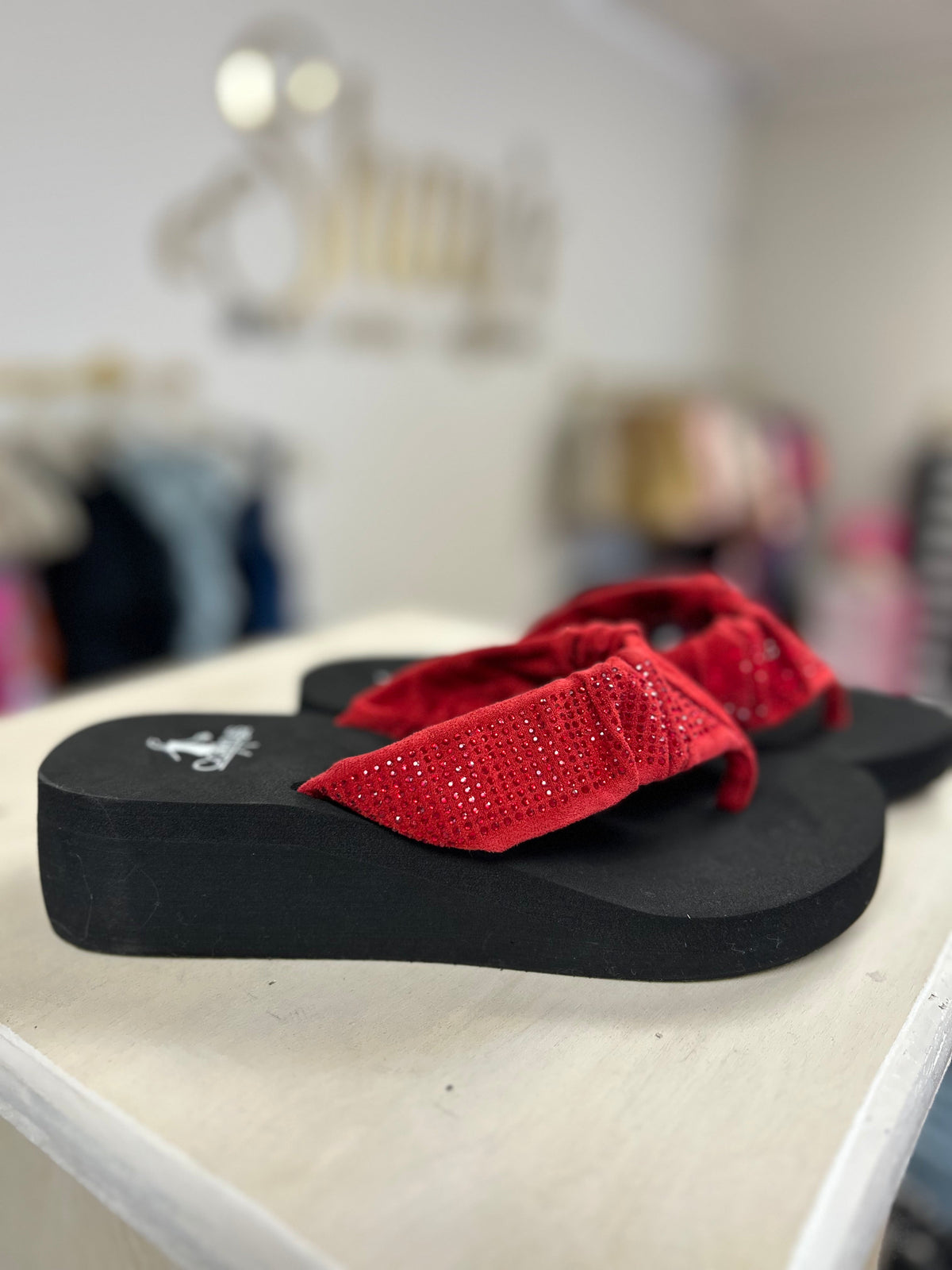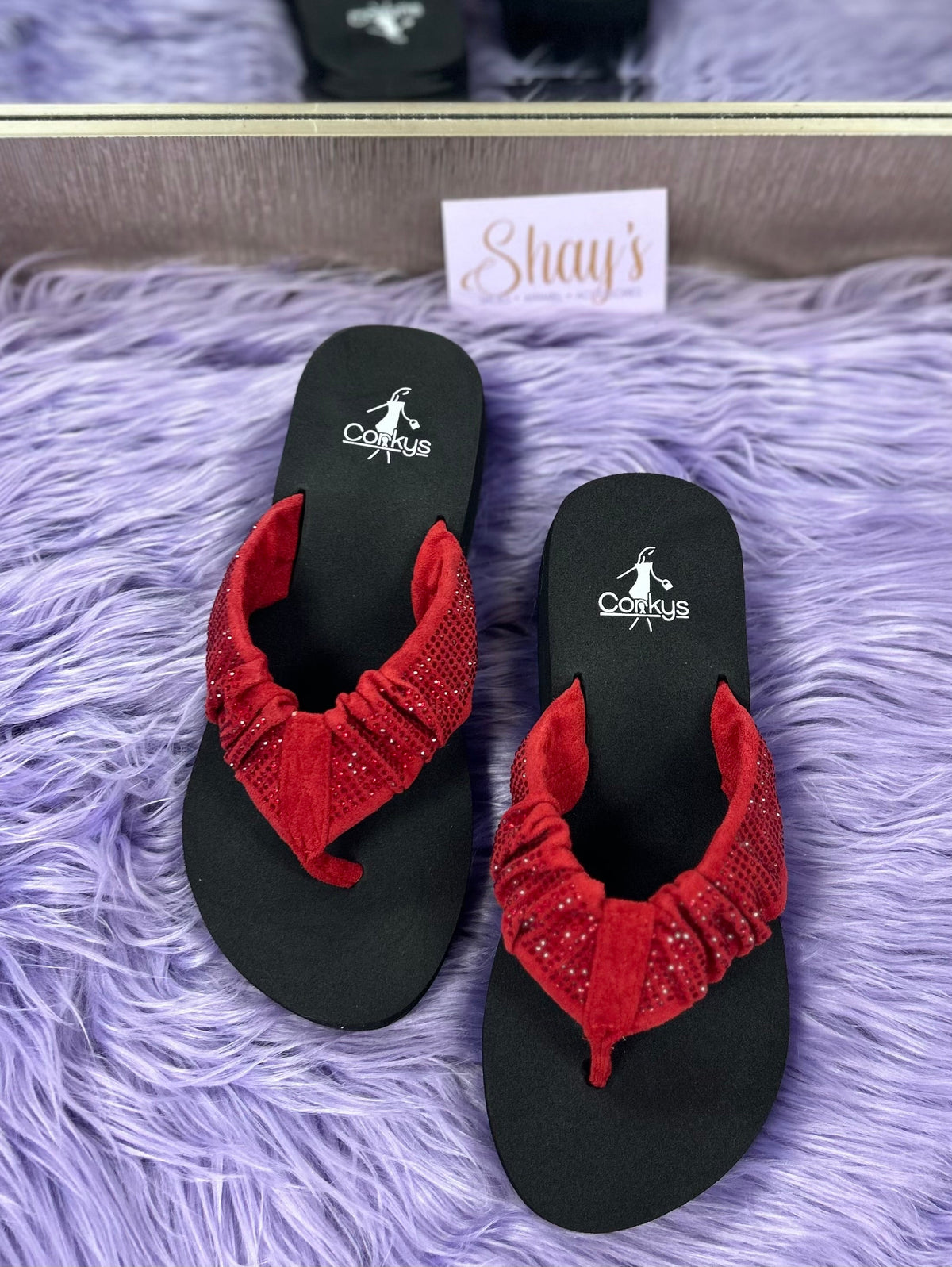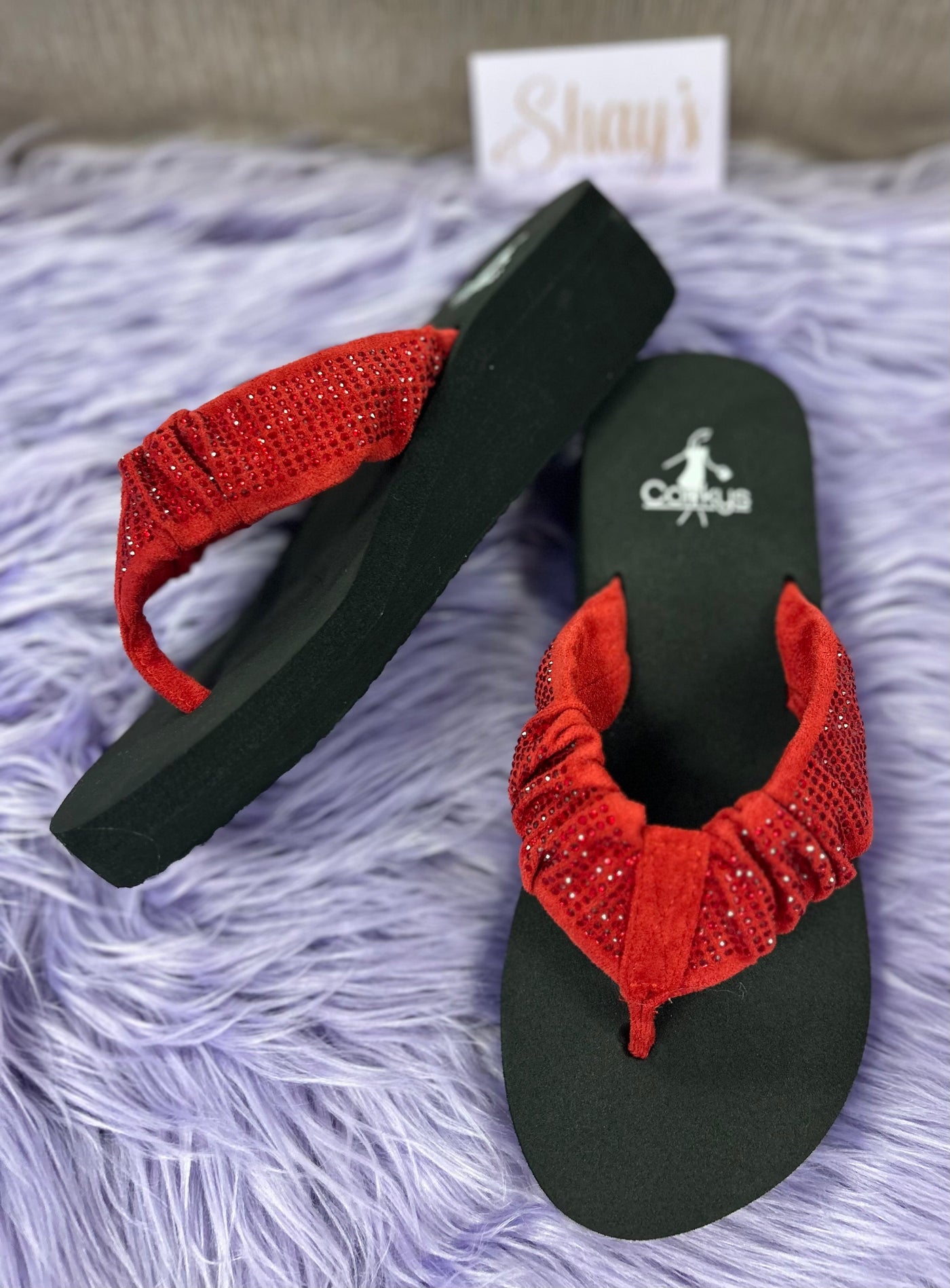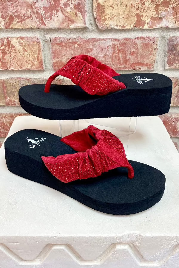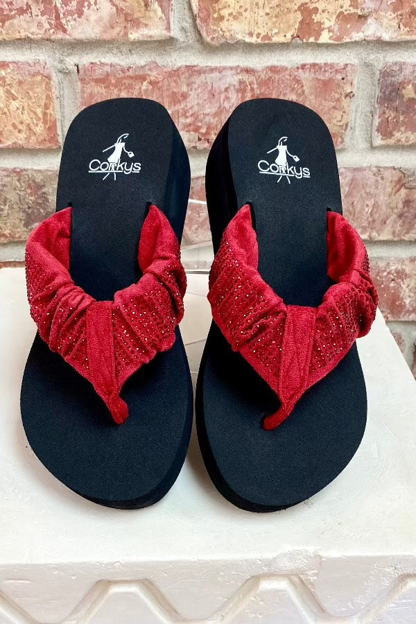 Step into summer with these Corkys Bauble Wedge Flip Flops! These flips flops are famous for holding their shape and boasting crystal accents, like this cute red one . Perfect for pairing with denim shorts, jeans, and dresses, these flip flops will add a fun and playful touch to your summer wardrobe. Get ready for a Summer Break in style!