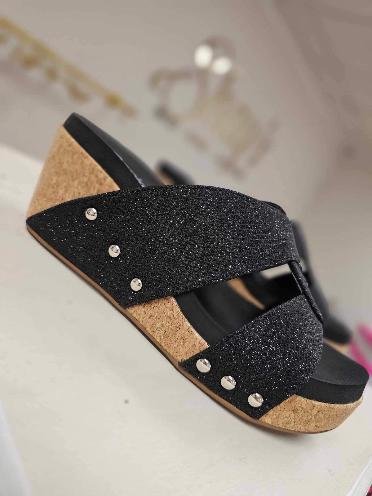 Enjoy both fashion and comfort with Corkys Bonny Wedge sandals. The slide-in wedge and black shimmer twist top make a statement, while soft cushion memory foam offers all-day support. Make sore feet a thing of the past and embrace effortless style.
