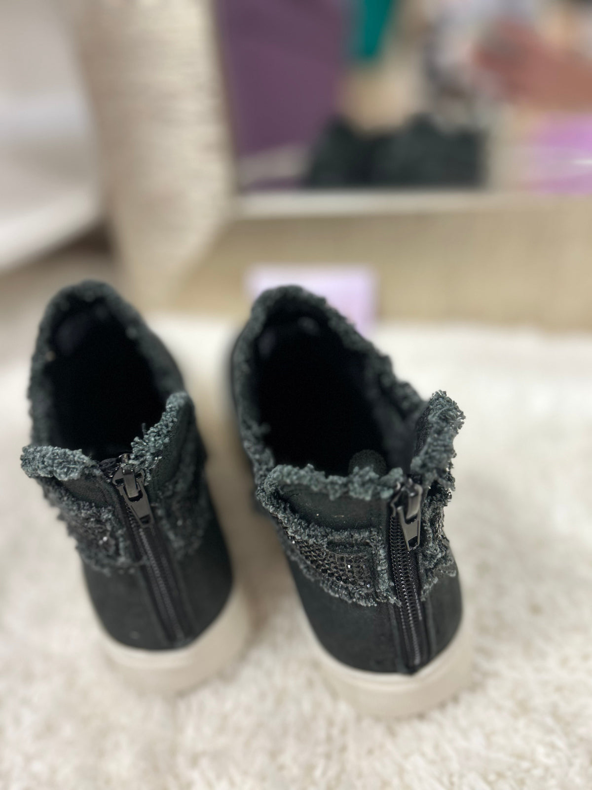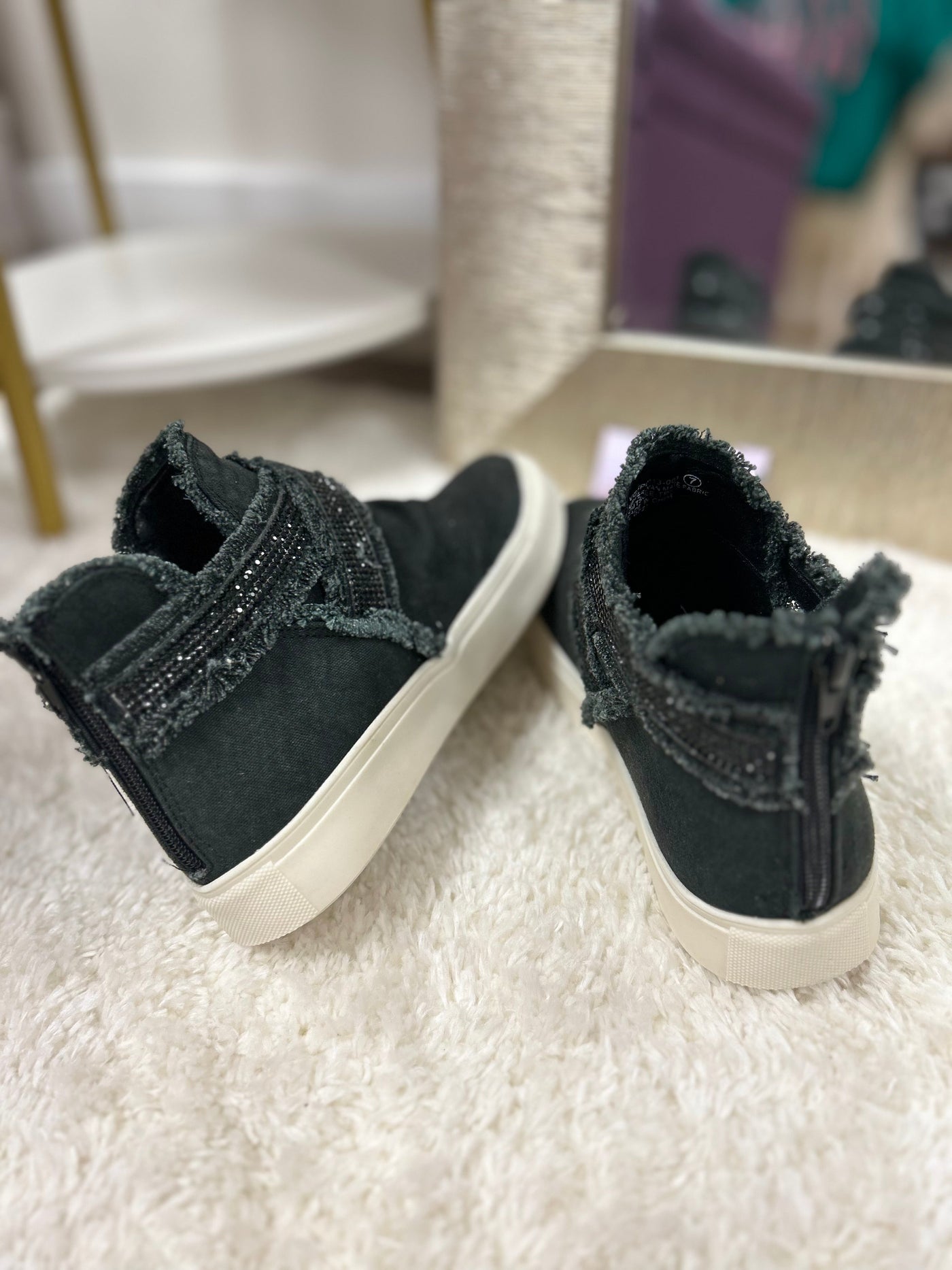 Expertly crafted with a sleek black distressed design, our Flora High Tops exude edgy style. The added rhinestone strap provides a touch of glamour, making these perfect for any occasion. Upgrade your sneaker game with 100% comfort and an alluring touch of rhinestone. Back zipper for easy on and off!