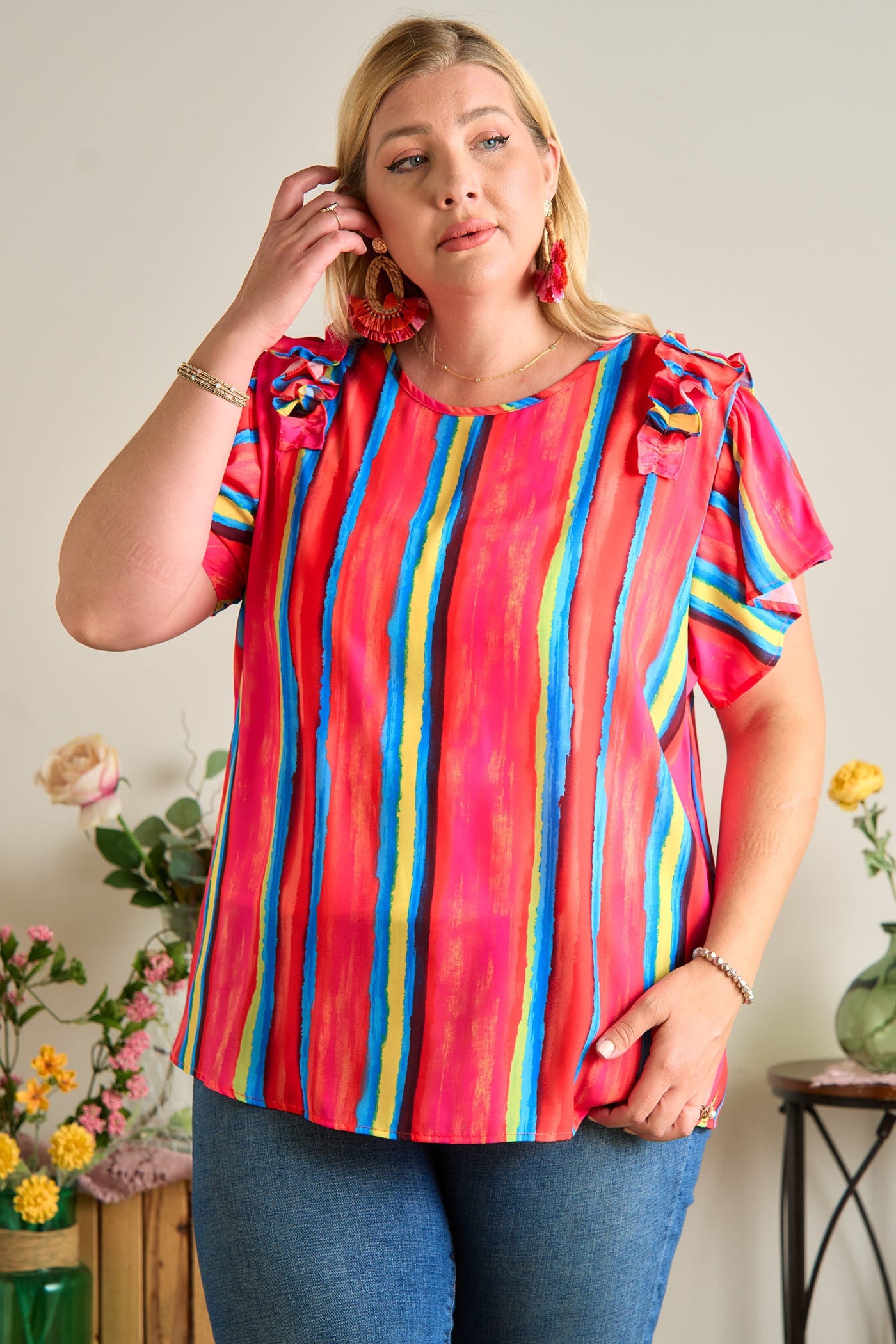 Elevate your wardrobe with our Abstract Drop Flutter Sleeve Top. This chic and sophisticated plus size top features flattering fluttering drop sleeves that will enhance your arms. With the perfect length for coverage and the option to dress it up or down, this top is a must-have for any occasion.