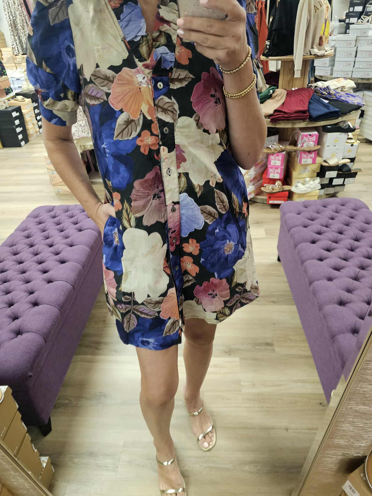 The Shay Floral Dress exudes elegance and sophistication. The deep colored floral pattern compliments all skin tones while the flattering fit is perfect for all body types. Transition effortlessly between seasons with this versatile piece. Pockets add to the functionality of this exquisite piece.