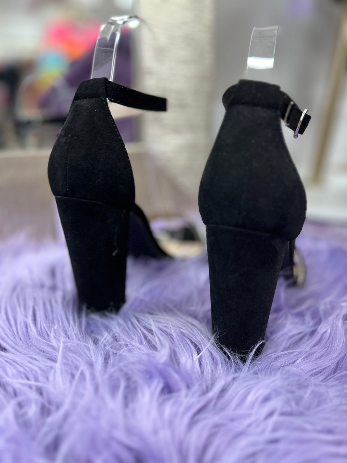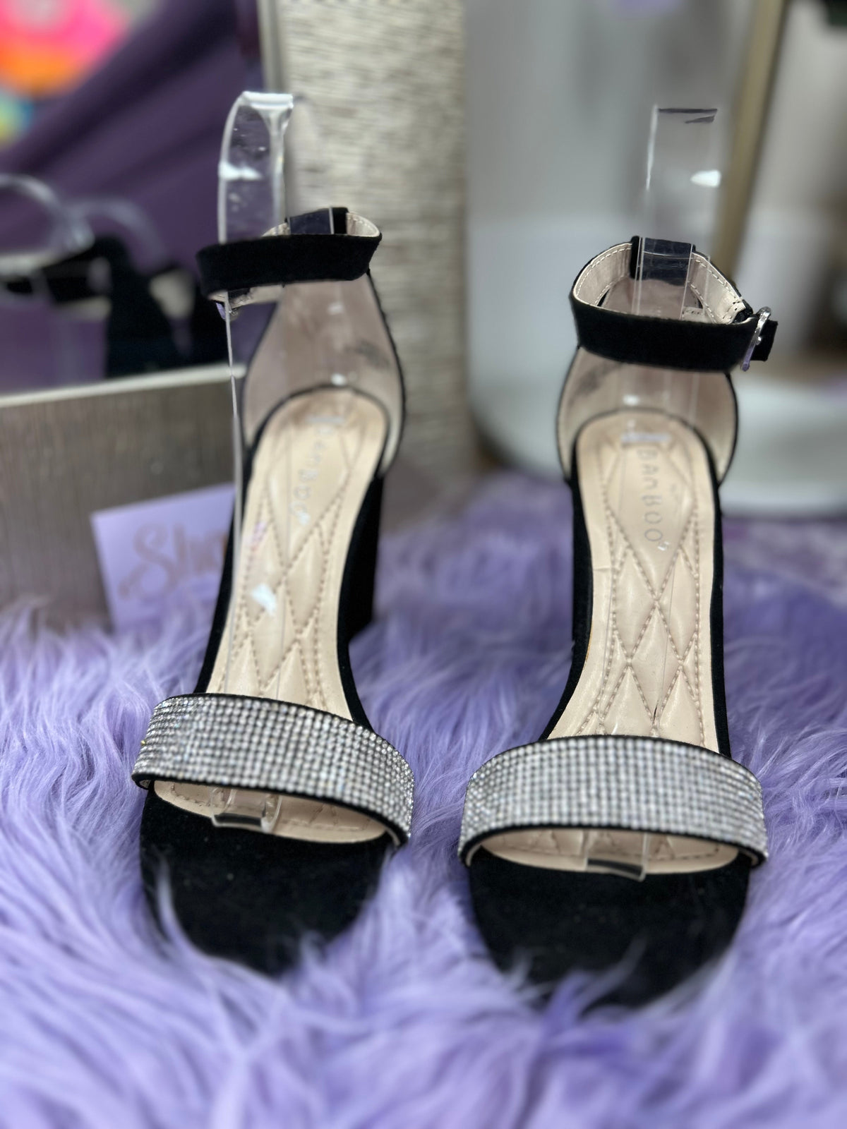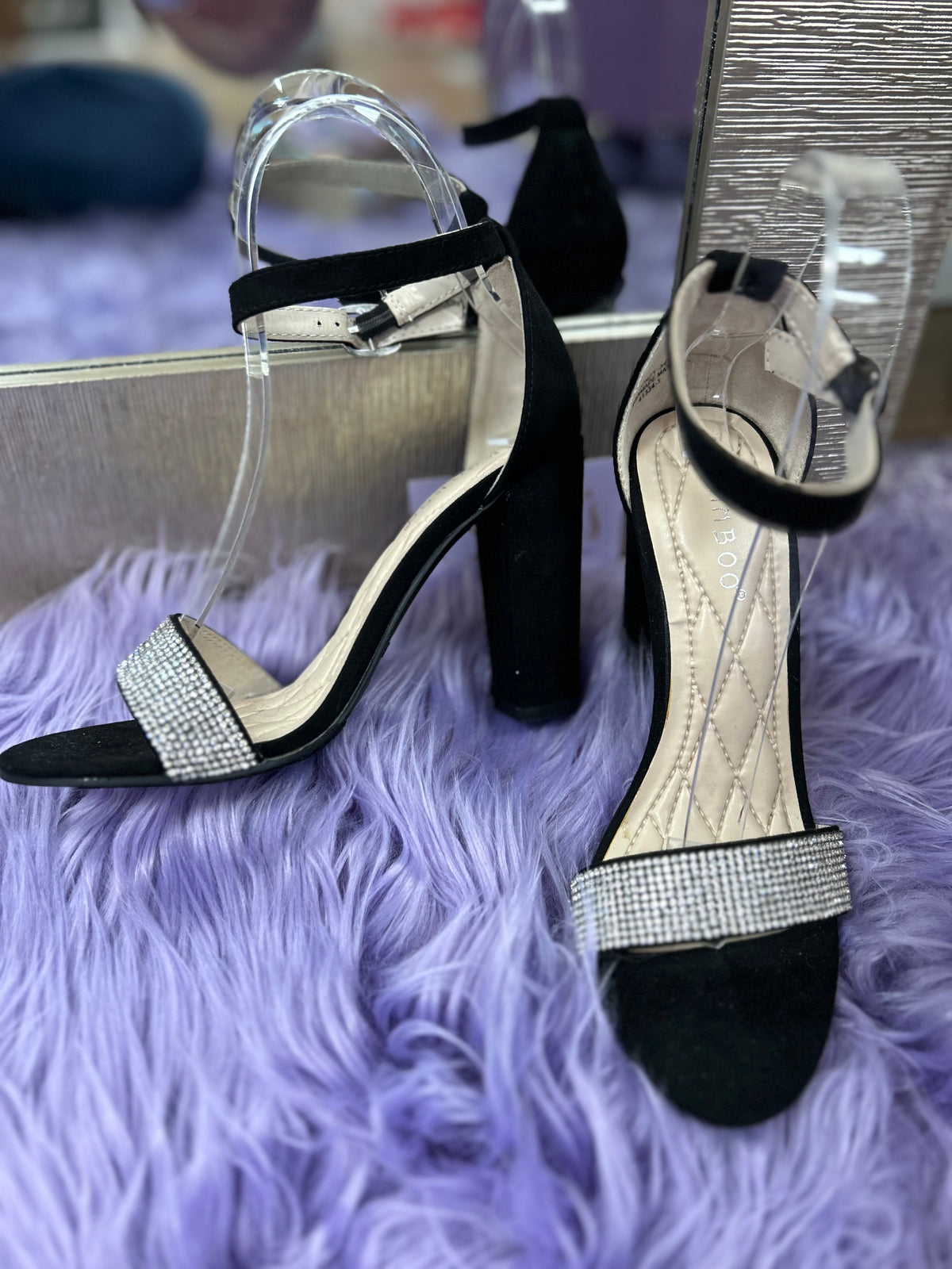 Introducing the Frenzy Heel - the ultimate addition to your shoe collection. These chic black heels are adorned with sparkling rhinestones on the strap, making them the perfect statement piece for any outfit. Plus, the adjustable ankle strap allows for a perfect, comfortable fit. Elevate your style with the Frenzy Heel.