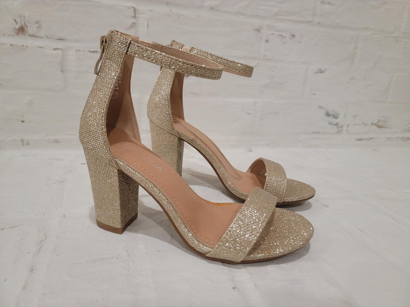 Champagne heel with zipper at back of heel for easy on and off. Approximately 2.5” heel.