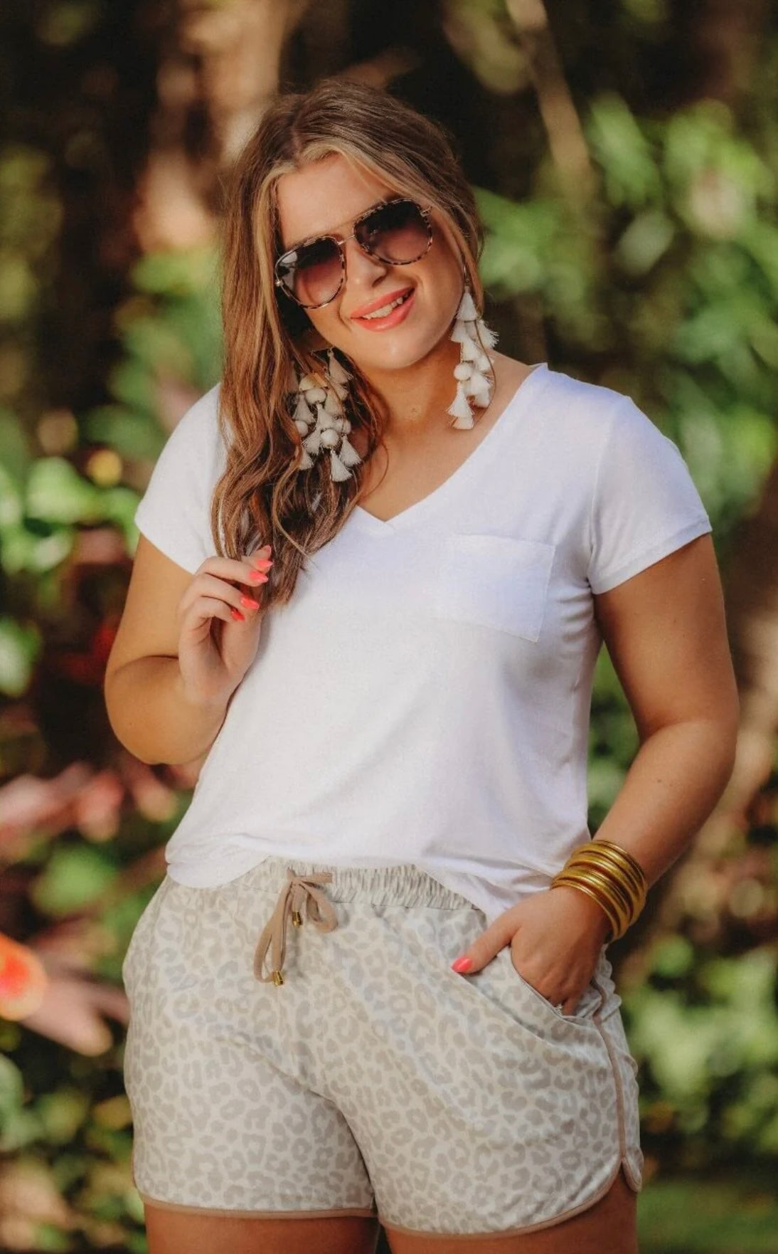 These grey and off white leopard drawstring shorts with khaki trim are so perfect for the spring and summer! Get the effortless yet chic look with these shorts. They feature a mid-rise, tie waist drawstring, & side pockets. These are a relaxed fit. These will be a staple in your vacation wardrobe!