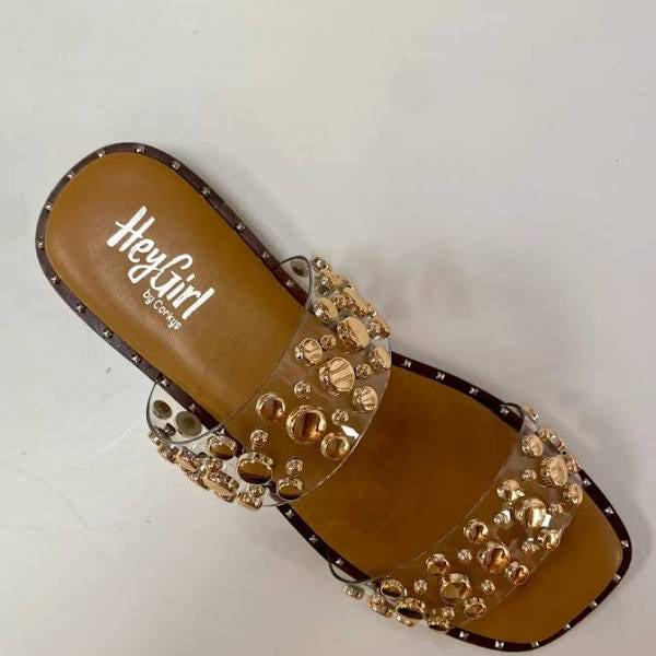 Introducing the new Magnet Sandals, the perfect footwear for the modern fashionista. These sandals come in a clear design with gold studded detailing that adds a touch of elegance to any outfit. With two clear straps that go over the top of your foot, these sandals are both stylish and comfortable. The cushioned sole ensures maximum comfort, while the tan sole adds a touch of sophistication to the overall design.