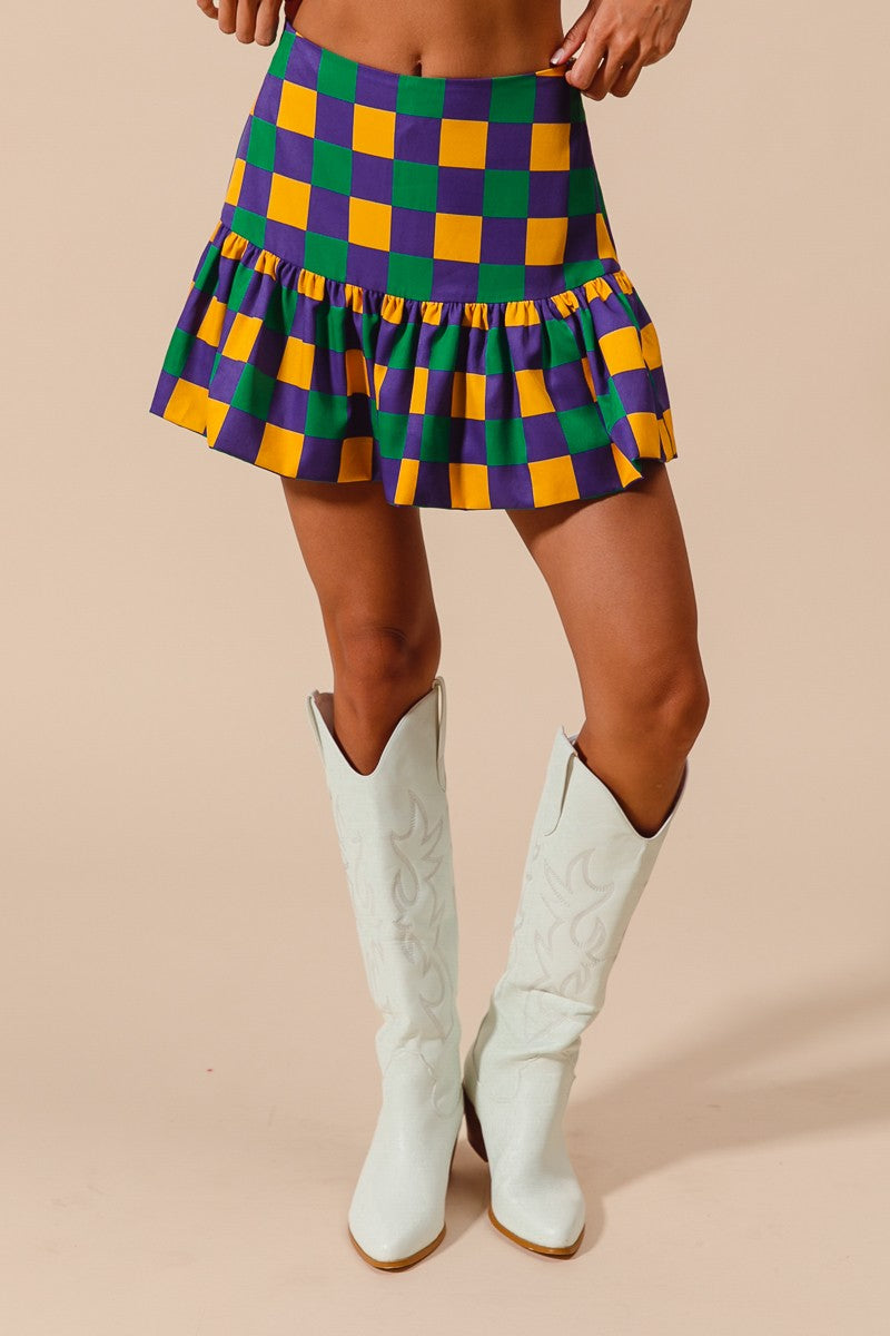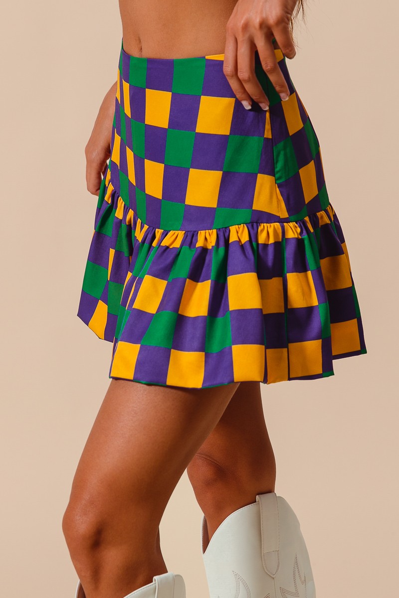MARDI GRAS COLOR CHECKER MINI BALLOON SKIRT WITH SIDE INVISIBLE ZIPPER AND SHORTS LINING