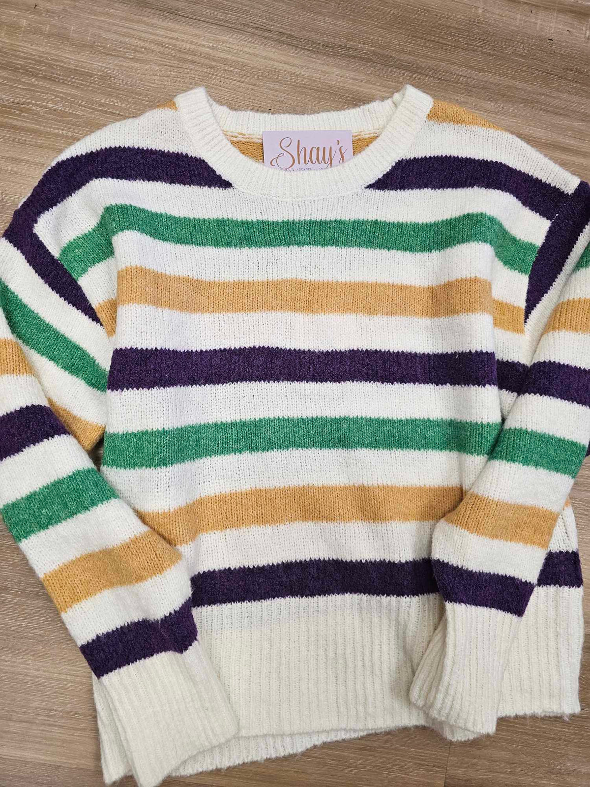 Inform when this item available MARDI GRAS COLOR STRIPE ROUND NECK SWEATER TOP