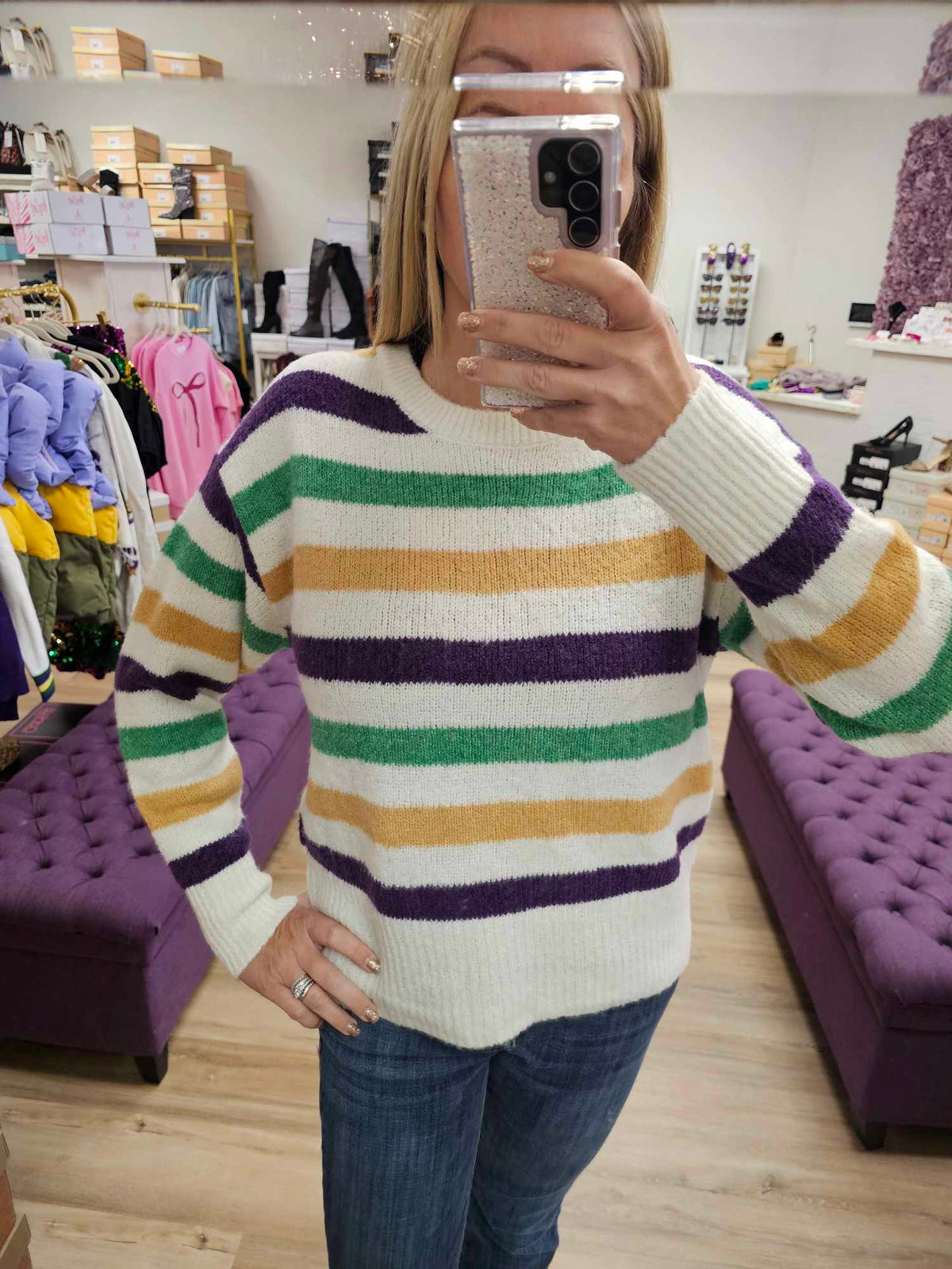 MARDI GRAS COLOR STRIPE ROUND NECK SWEATER TOP