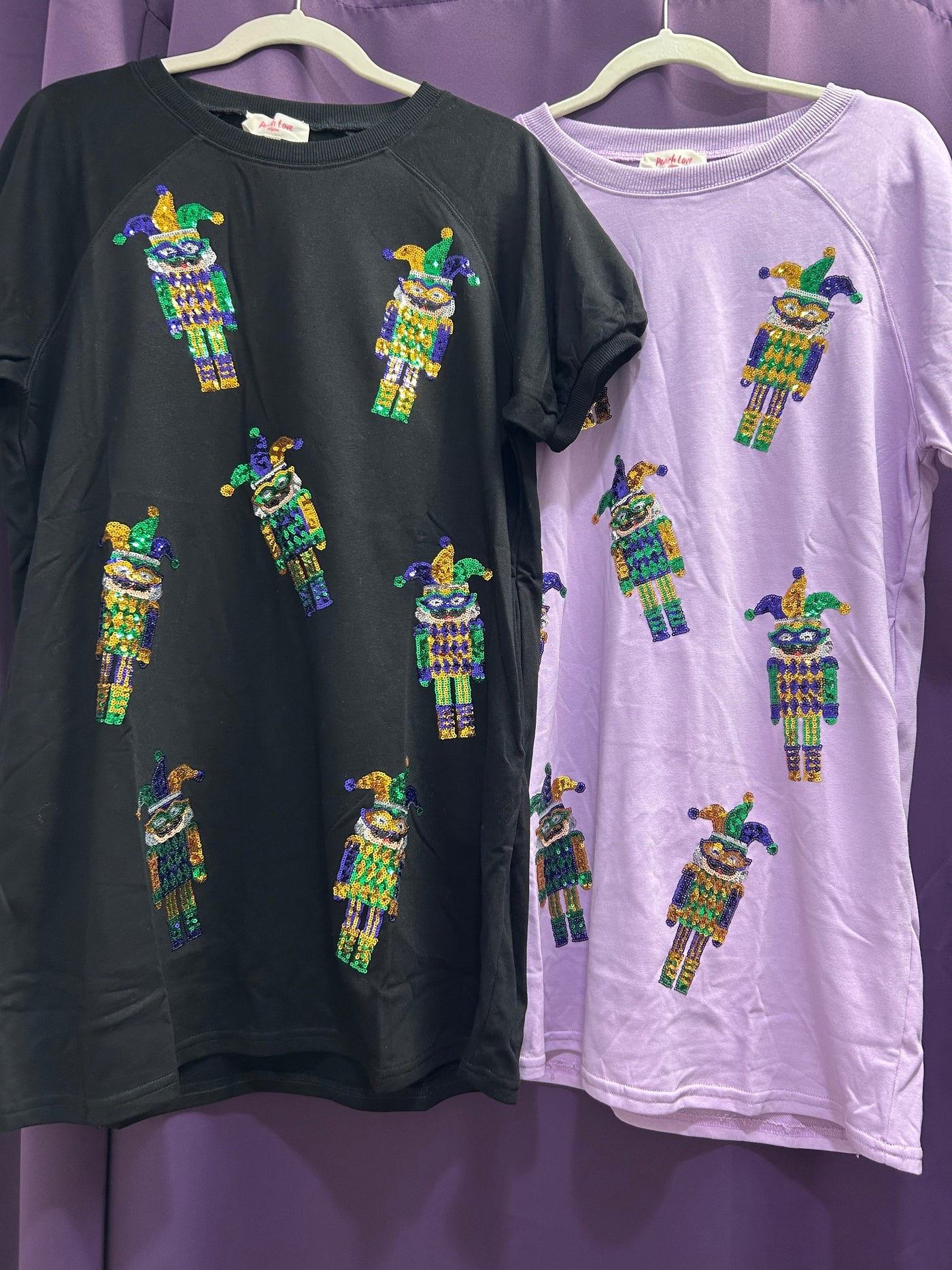 Embrace the festive spirit with our Mardi Gras Sequin Nutcracker Dress. Made with comfortable, T-shirt material and designed to flatter your body, you can show off your love for both Mardi Gras and nutcrackers. Plus, with convenient pockets, this dress is perfect for any occasion.