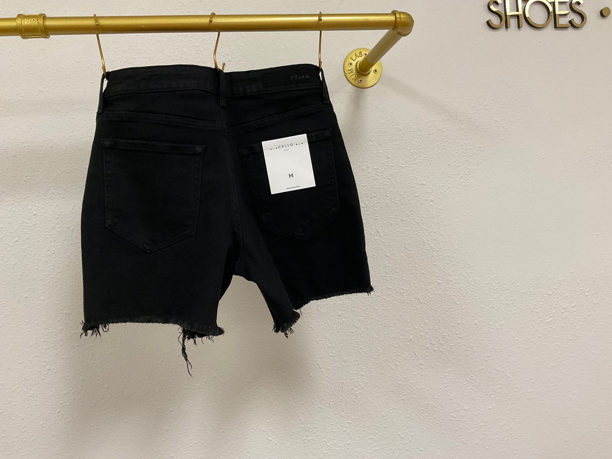 High Rise black jean shorts with uneven frayed hem. The perfect amount of stretch for all day comfort!