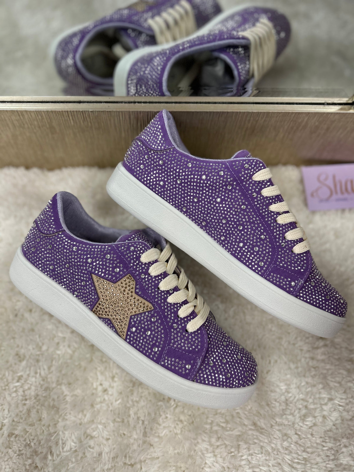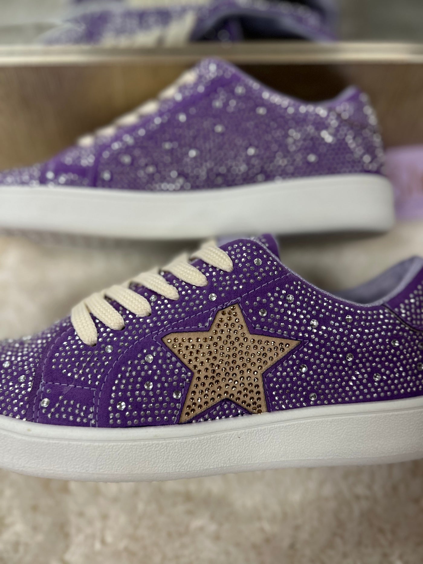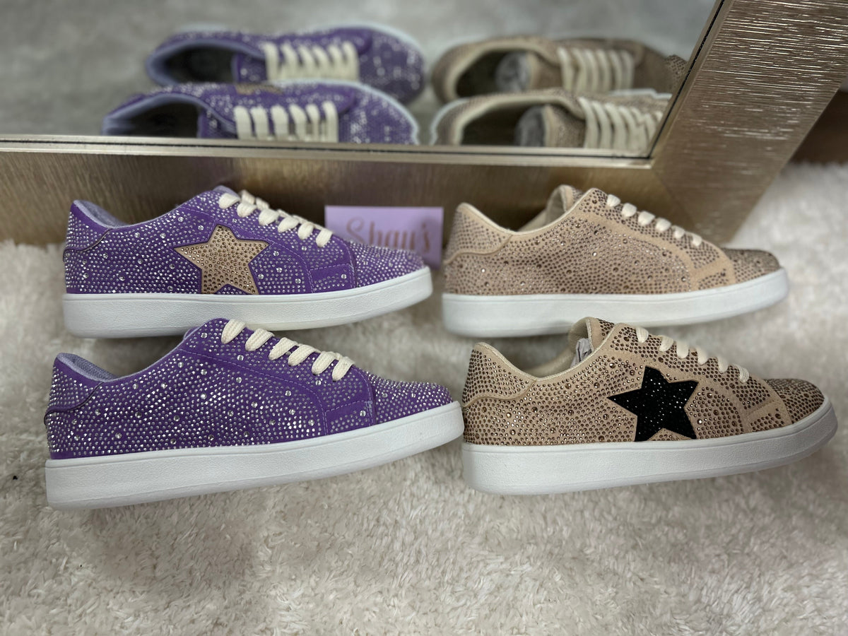 Introducing Miel Tennis - the ultimate game day shoe! Whether you're cheering on your favorite team or just want to make a statement, these sparkling rhinestone tennis shoes have got you covered. Stay stylish and comfortable with the trendy rhinestone star detail. Perfect for any game day or to add a pop of sparkle to your day to day wardrobe! They’re must haves in both colors options.