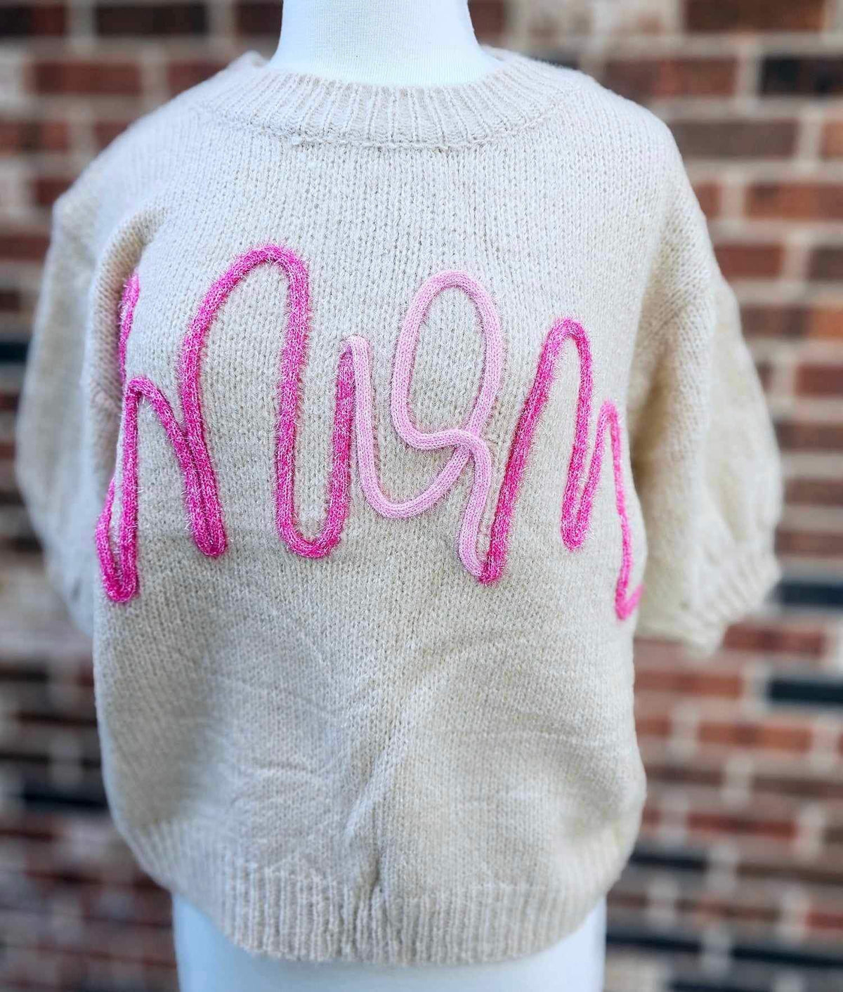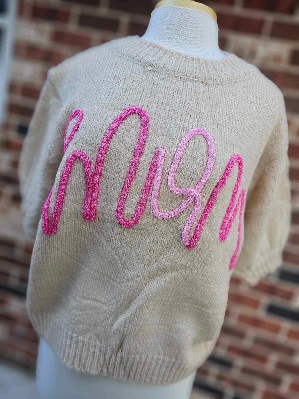 MOM Metallic Tinsel Short Puff Sleeve Top - OATMEAL - Small