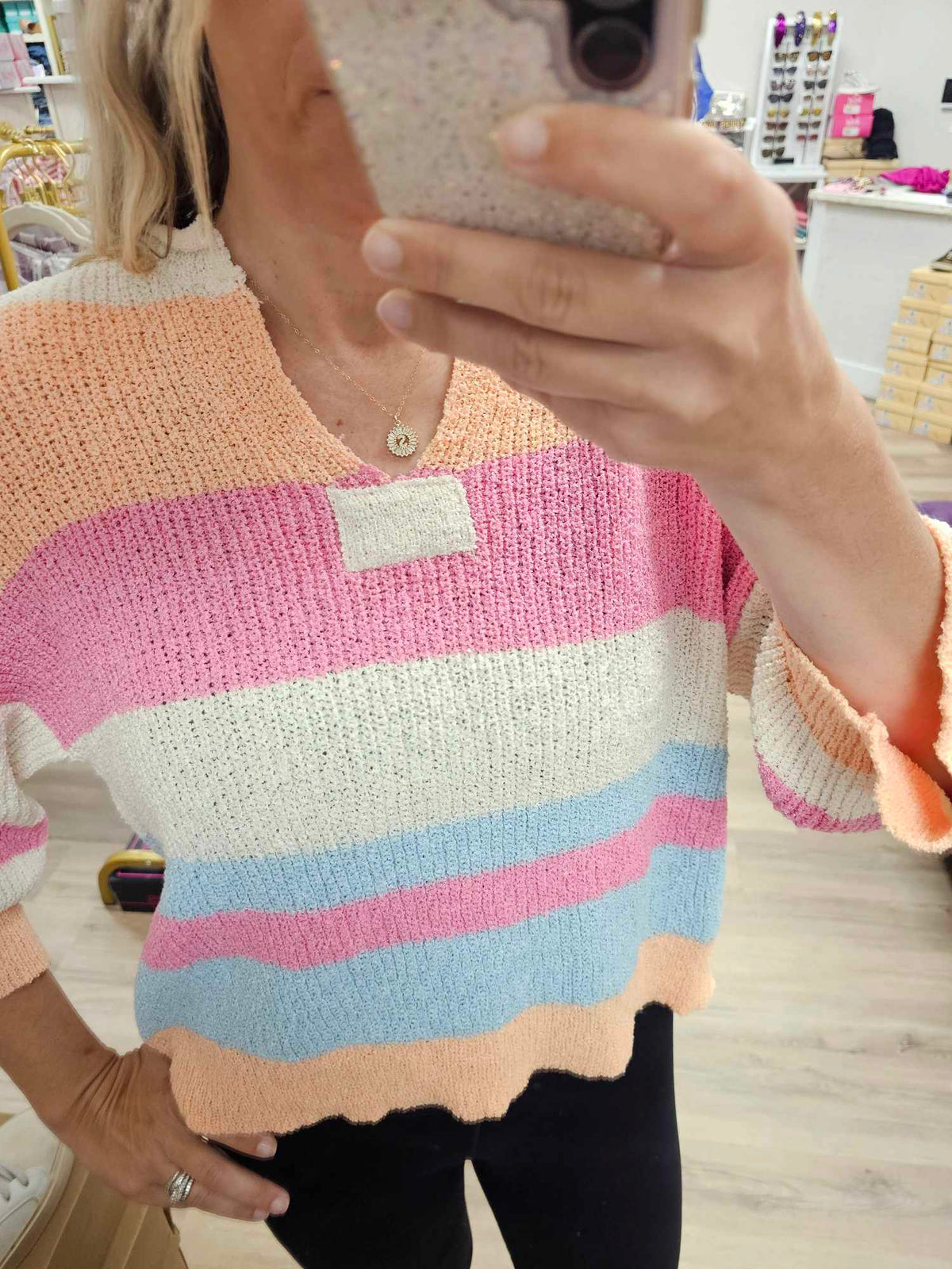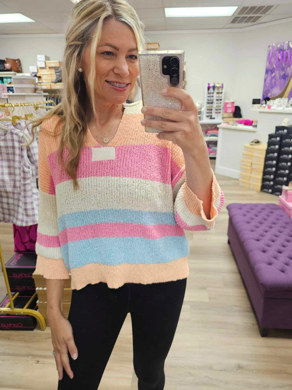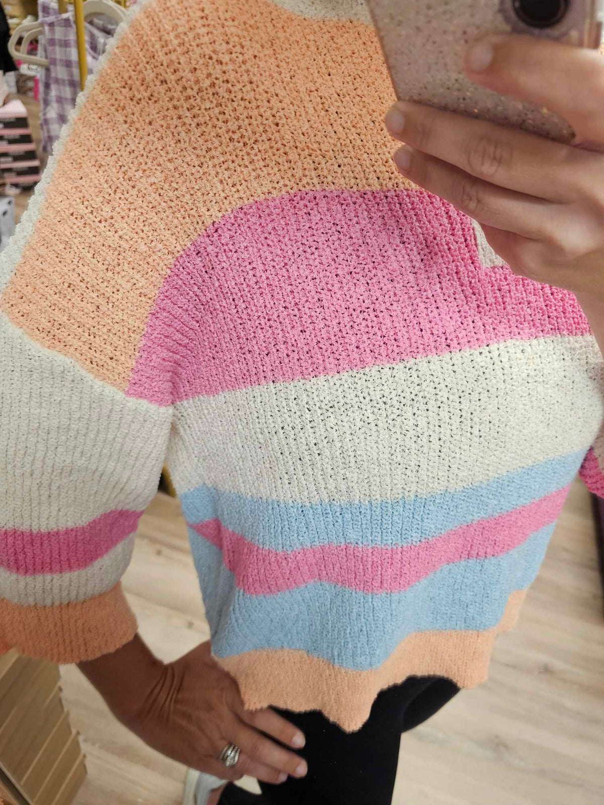 This breezy sweater top features three quarter length sleeves and a notched neck for a pop of detail. Versatile and easy to dress up or down, it's the perfect addition to any outfit. Stay stylish and comfortable with this Striped Notch Neck Three Quarter Sleeve Sweater Top.