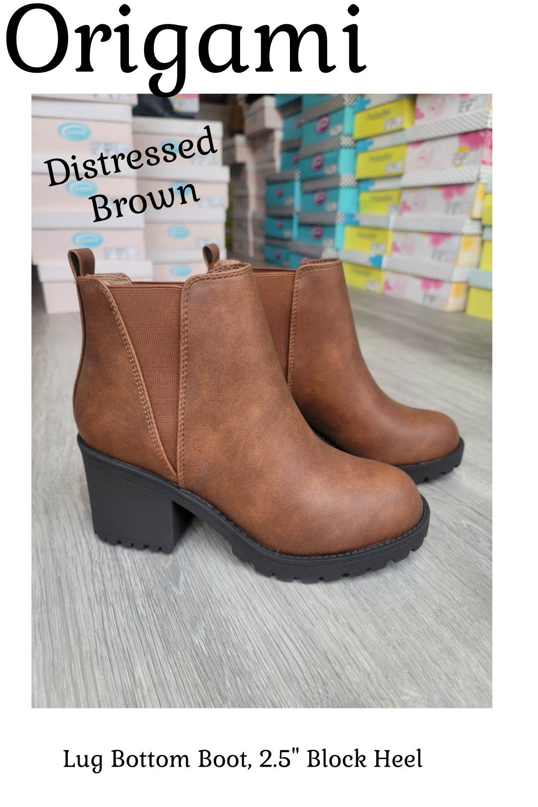 Lug Bottom boot easy pull on and pull off. Love the distressed look of these, goes great with jeans!!
