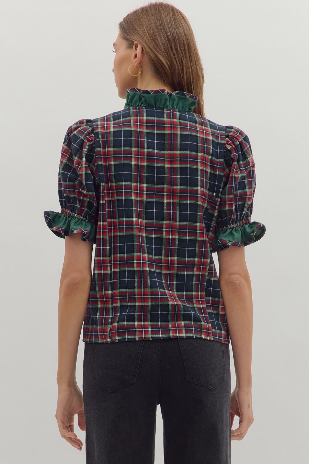 Plaid short puff sleeve top featuring contrast ruffle trim and snap button closure at bust. Unlined. Woven. Non-sheer. Lightweight.