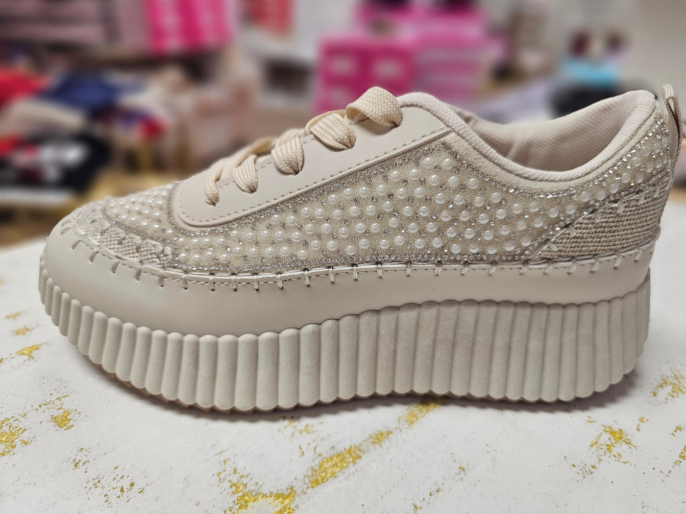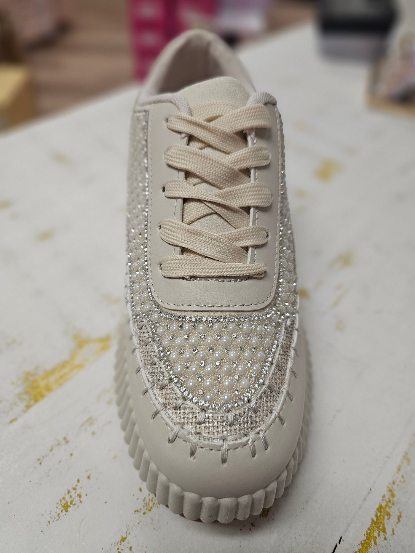 Elevate your style with Remi - Pearl Tennis. These eye-catching sneakers offer superior comfort and add a touch of glamour with pearls and rhinestones. Whether dressing up or down, these shoes will make you stand out day or night.