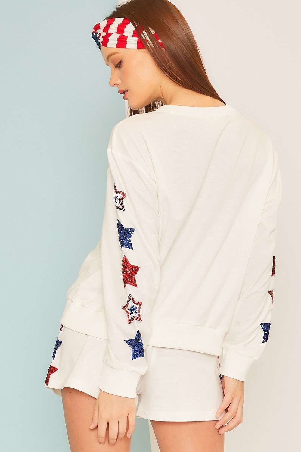 Stay stylish and patriotic with our Round Neck Long Sleeve Star Patch French Terry Sweater. Perfect for celebrating the 4th of July, this sweater features a classic round neck design, long sleeves, and stars embroidered on the sleeves. Keep cozy and fashionable while showing off your American pride.