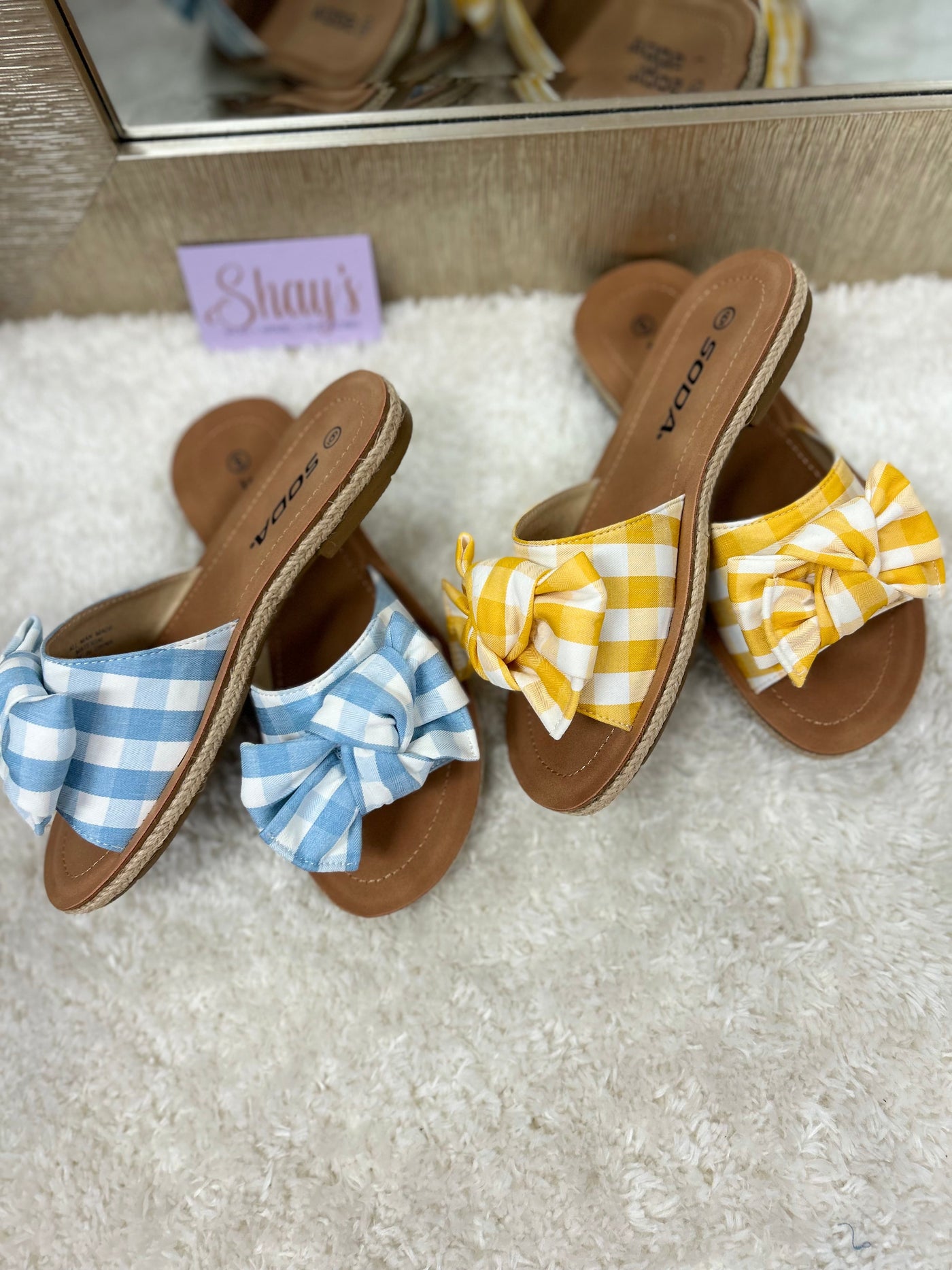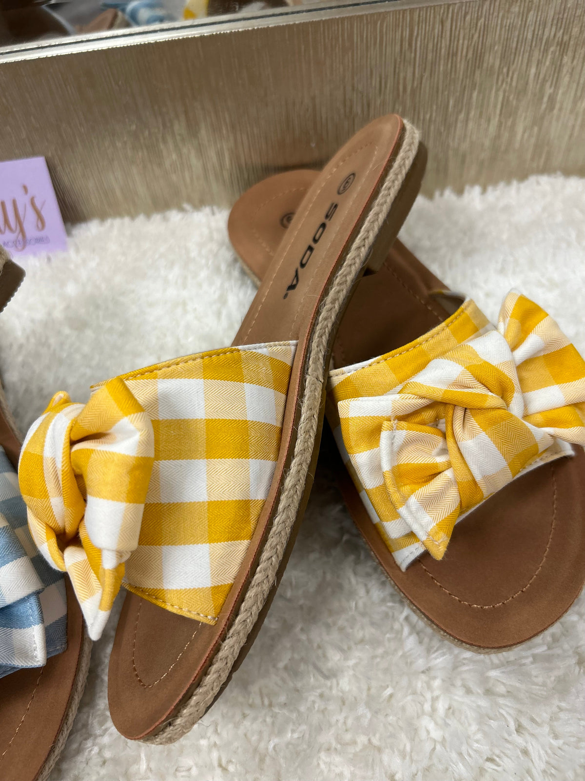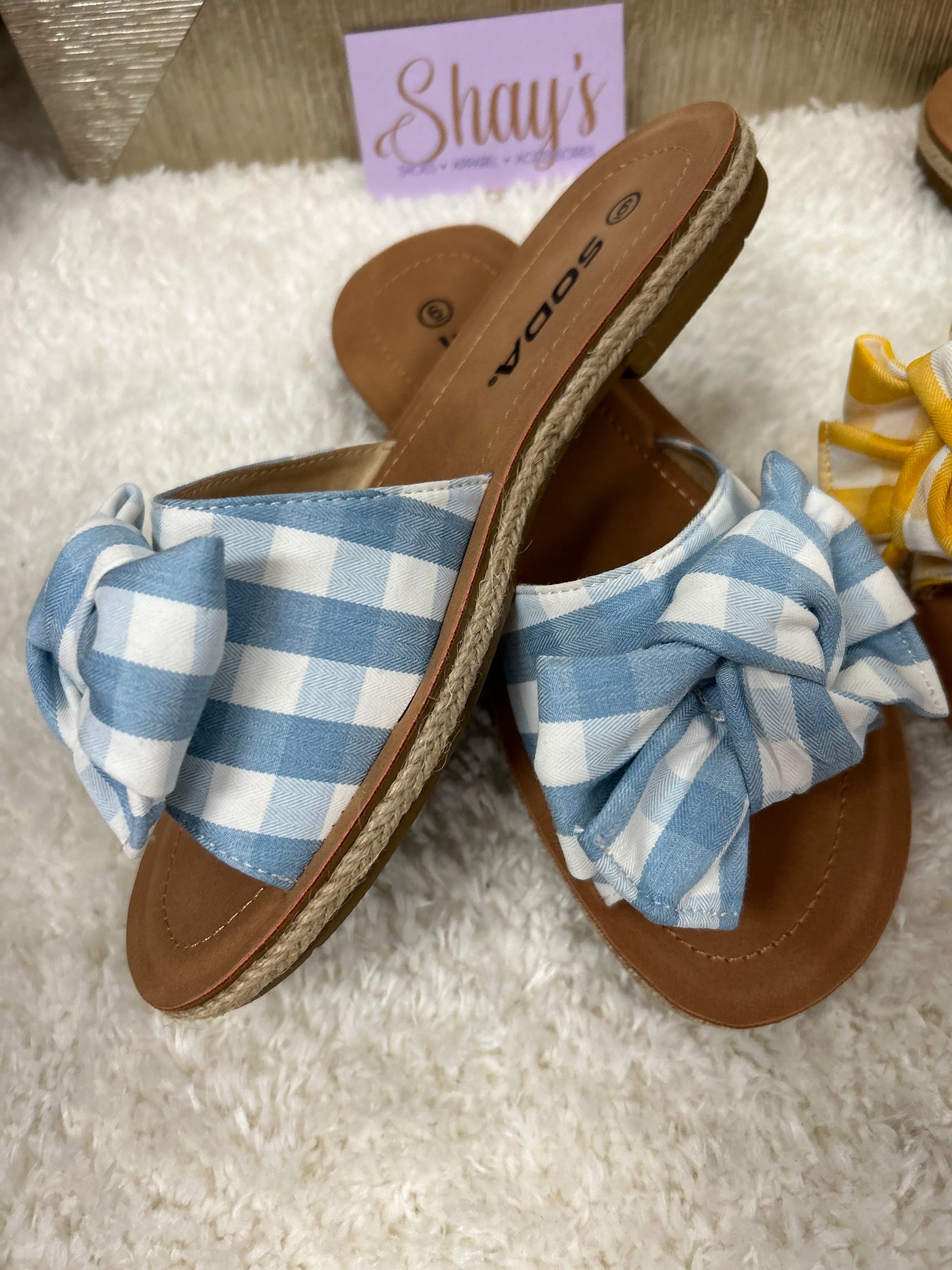 Introducing the Script Sandal - the perfect combination of comfort and style. Slip on these super comfortable sandals, featuring a gingham printed fabric bow, available in a variety of vibrant spring colors. Dress up or down and stand out with these fashionable and easy-to-wear sandals.