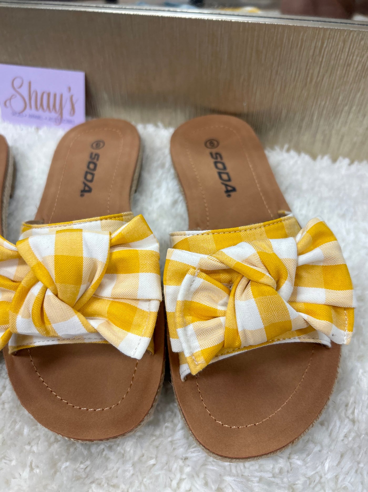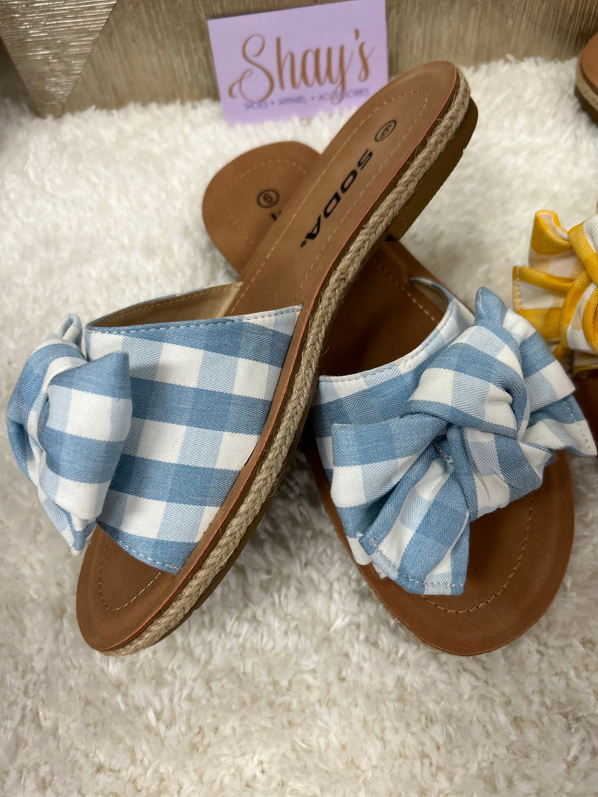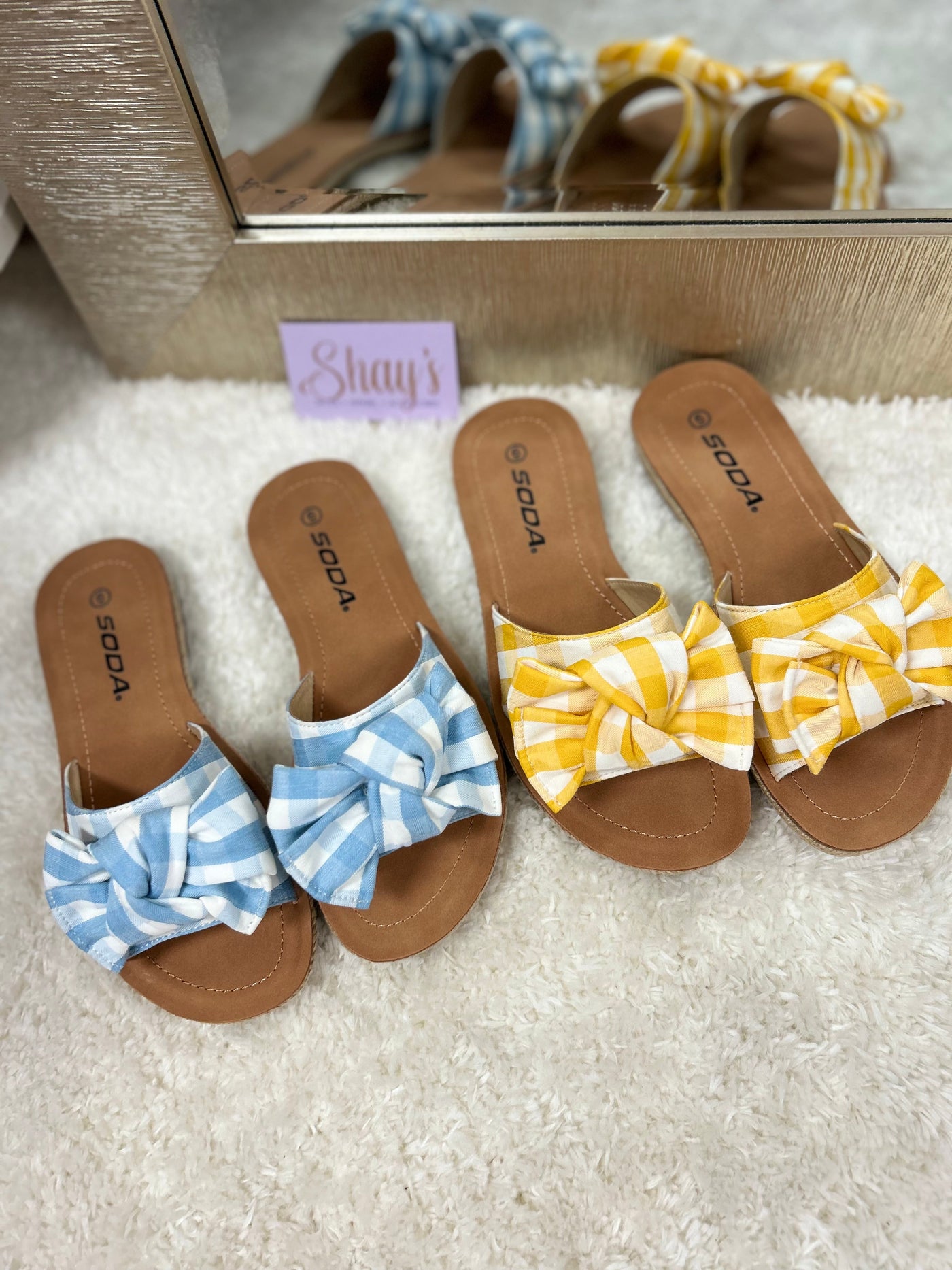 Introducing the Script Sandal - the perfect combination of comfort and style. Slip on these super comfortable sandals, featuring a gingham printed fabric bow, available in a variety of vibrant spring colors. Dress up or down and stand out with these fashionable and easy-to-wear sandals.