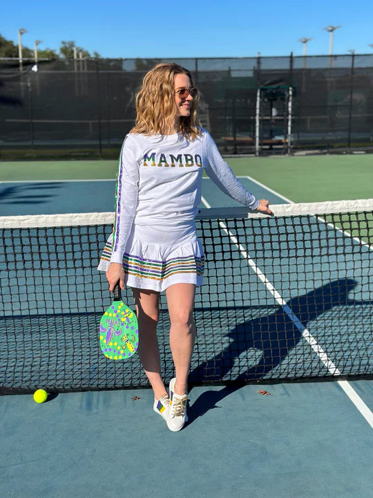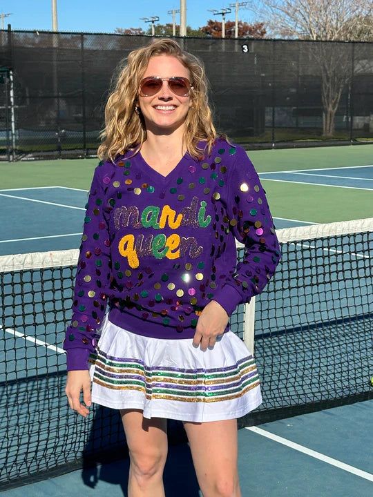 Your new go to Mardi Gras piece! With built in stretchy shorts underneath these pleated, sequin stripe skorts are a classic style that work all season long. This eye-catching skort features purple, green, and gold sequin stripes for a Mardi Gras inspired look.