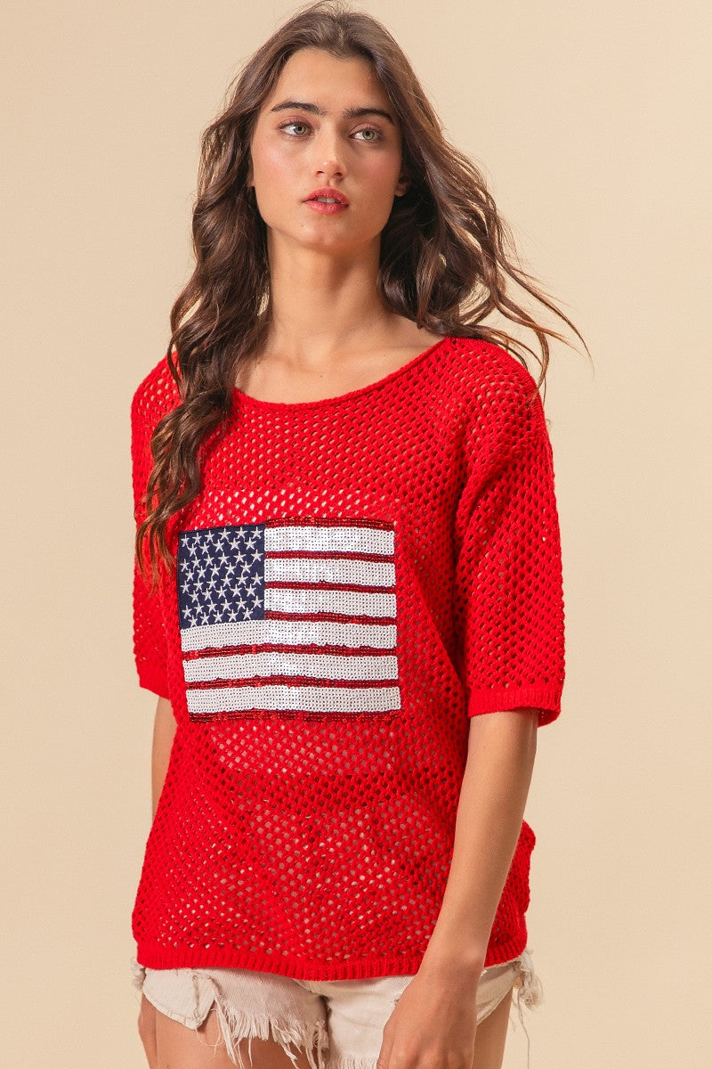 This classy and chic open knit top features a sequin flag, perfect for showing off your patriotic side. With short sleeves, this top is both comfortable and stylish. Show your love for your country with this versatile piece that can be dressed up or down. Perfect throw and go top for all your beach days!