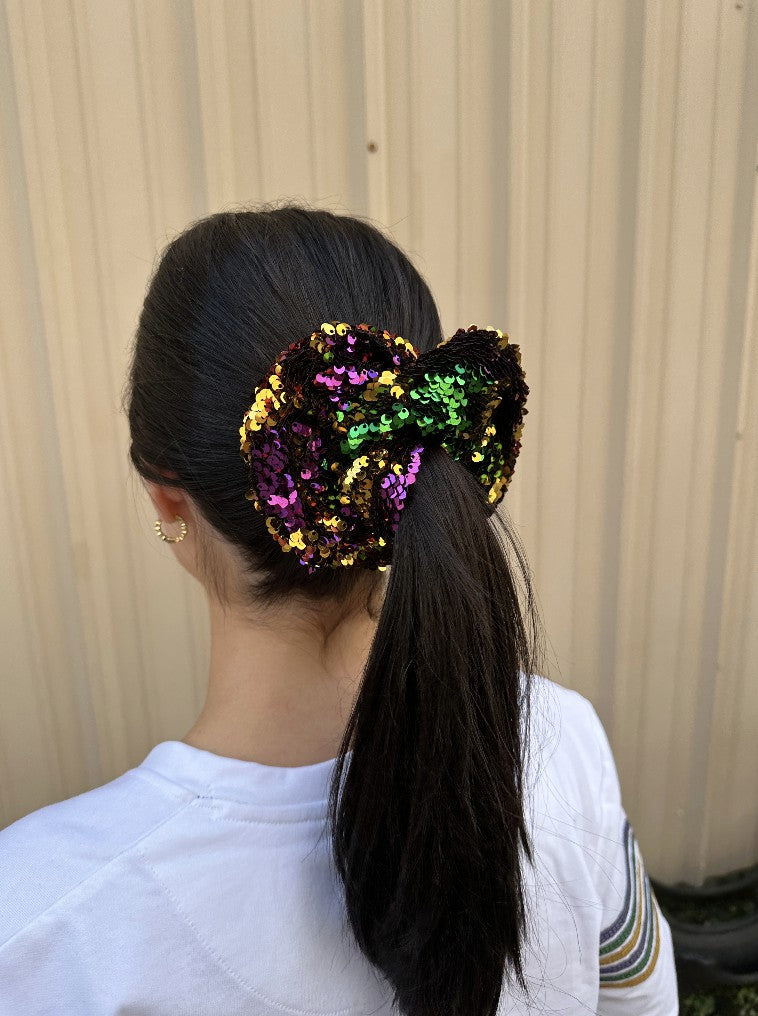 These stylish sequin scrunchies are the perfect finishing touch for all your Mardi Gras looks this season! Each scrunchie is reversible to gold.