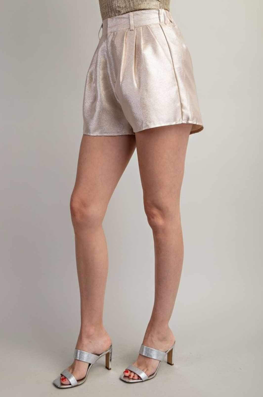 "Add a touch of sparkle and shine to your wardrobe with our lightweight pleated shorts. With a convenient zipper and button closure, and functional front pockets, these shorts are both stylish and practical."