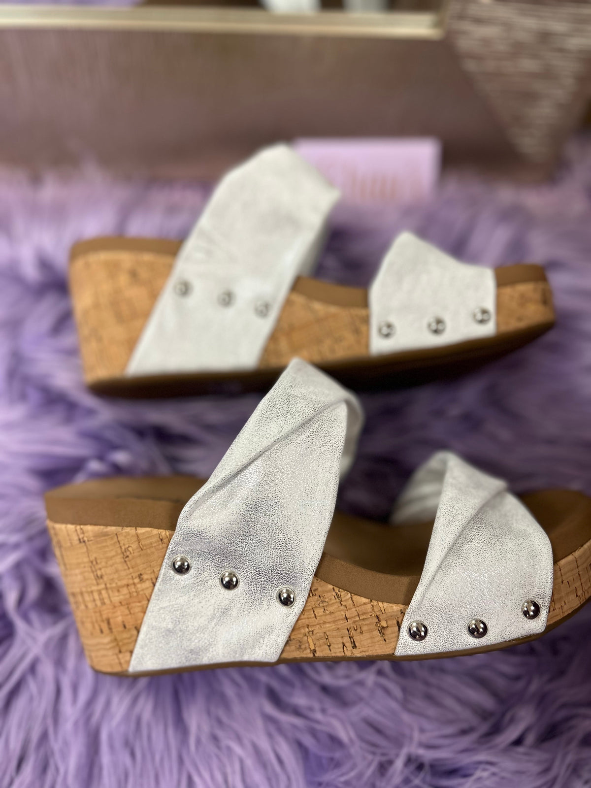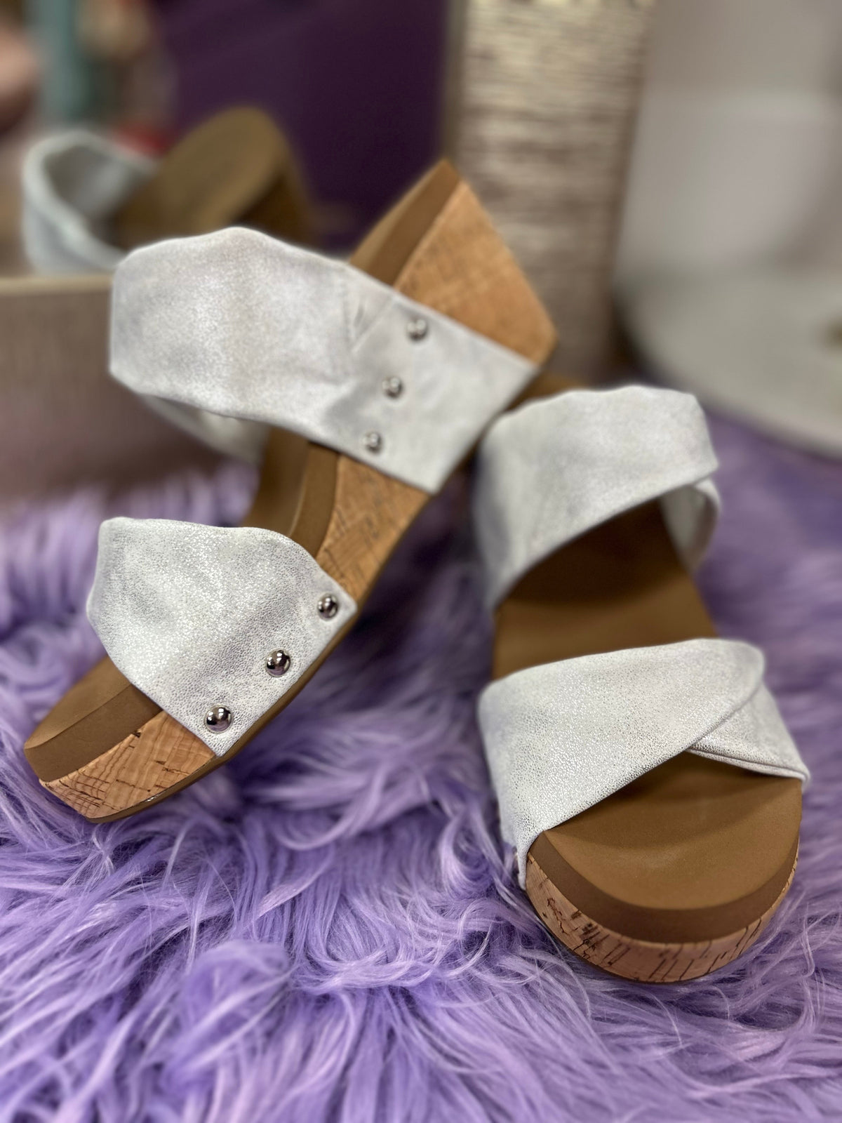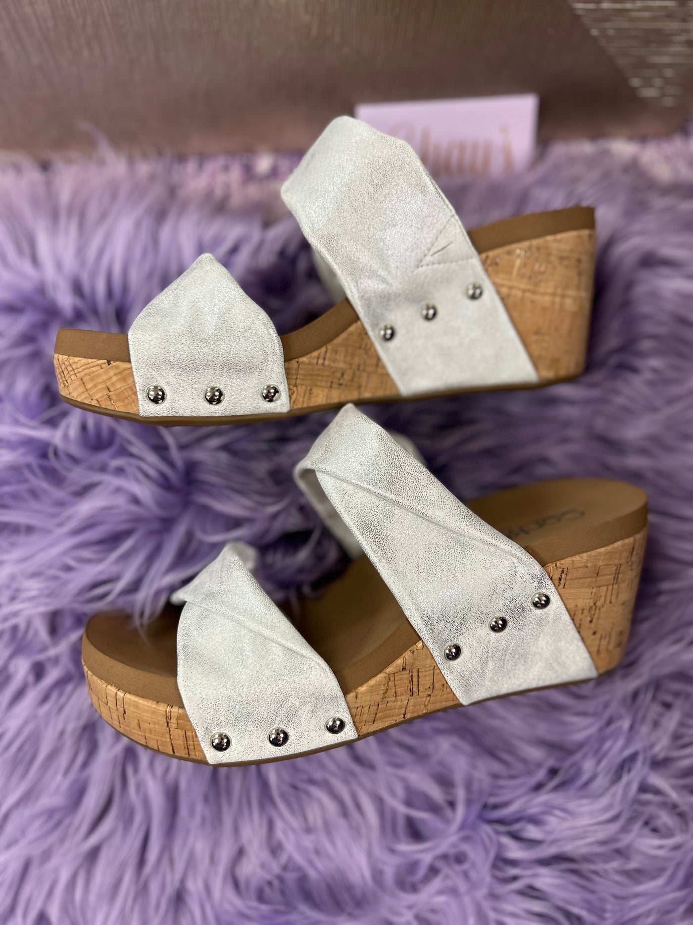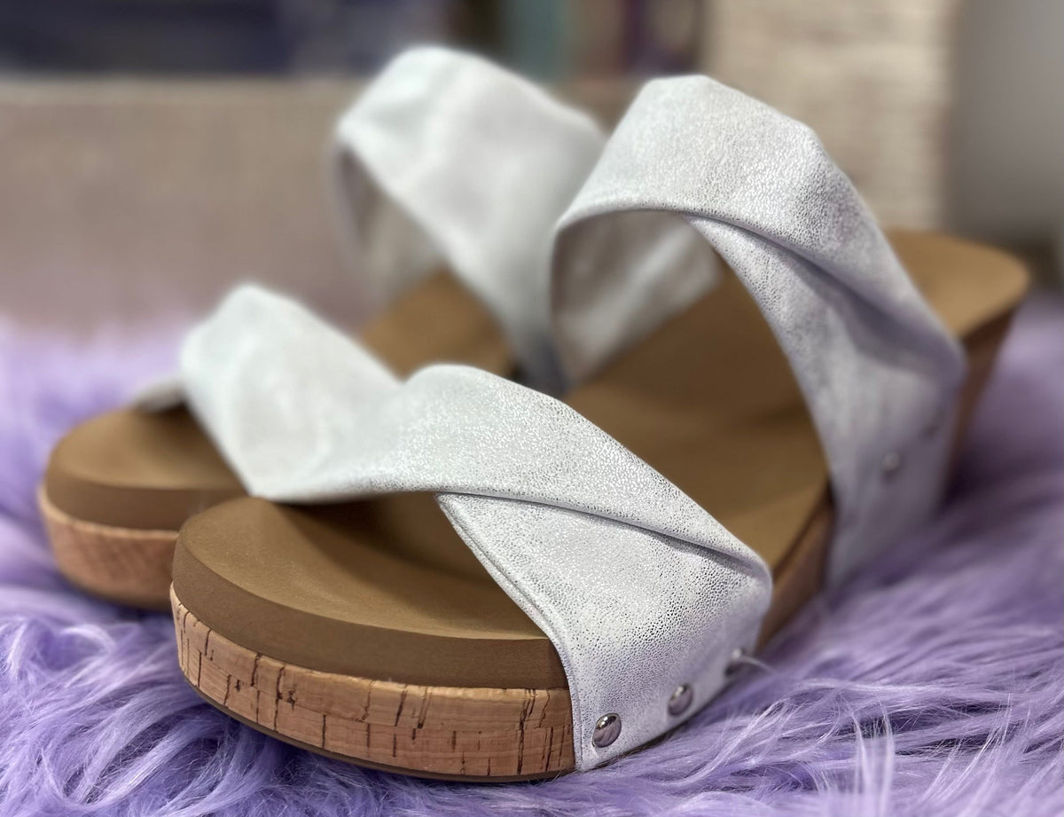 The Stranded Wedge by Corkys offers the ultimate comfort with its exclusive sole, perfect for all-day wear. Its twist detail on the straps adds a touch of uniqueness to its classy design. Available in white metallic, it adds just the right amount of sparkle to your wardrobe. Trust the best selling Corkys brand for a stylish and comfortable wedge.