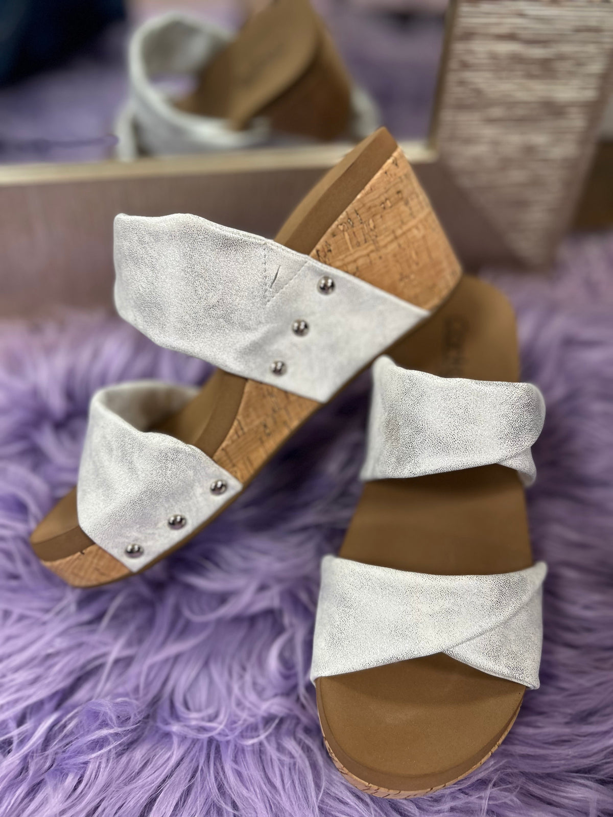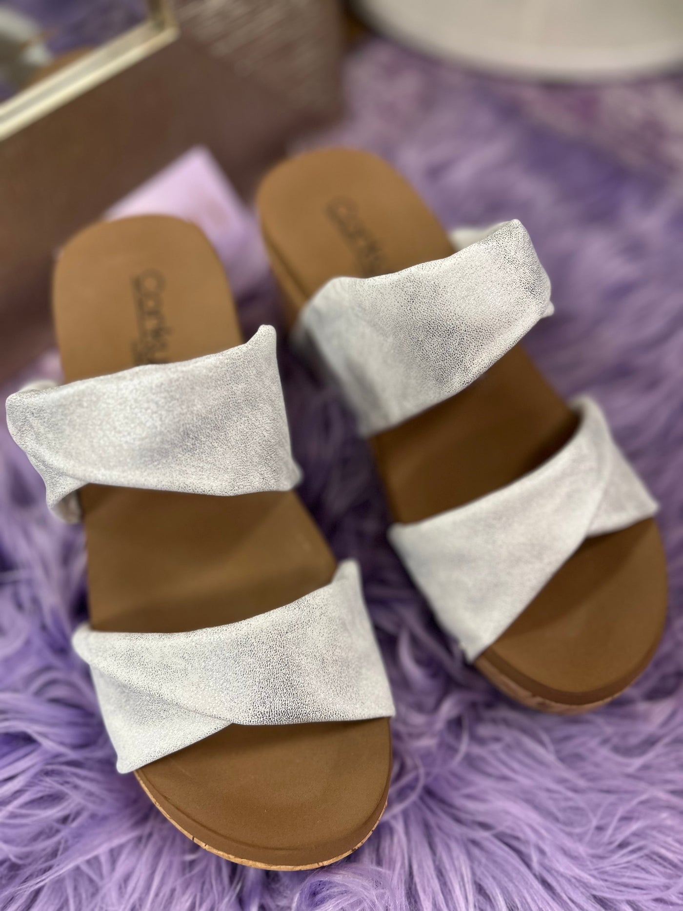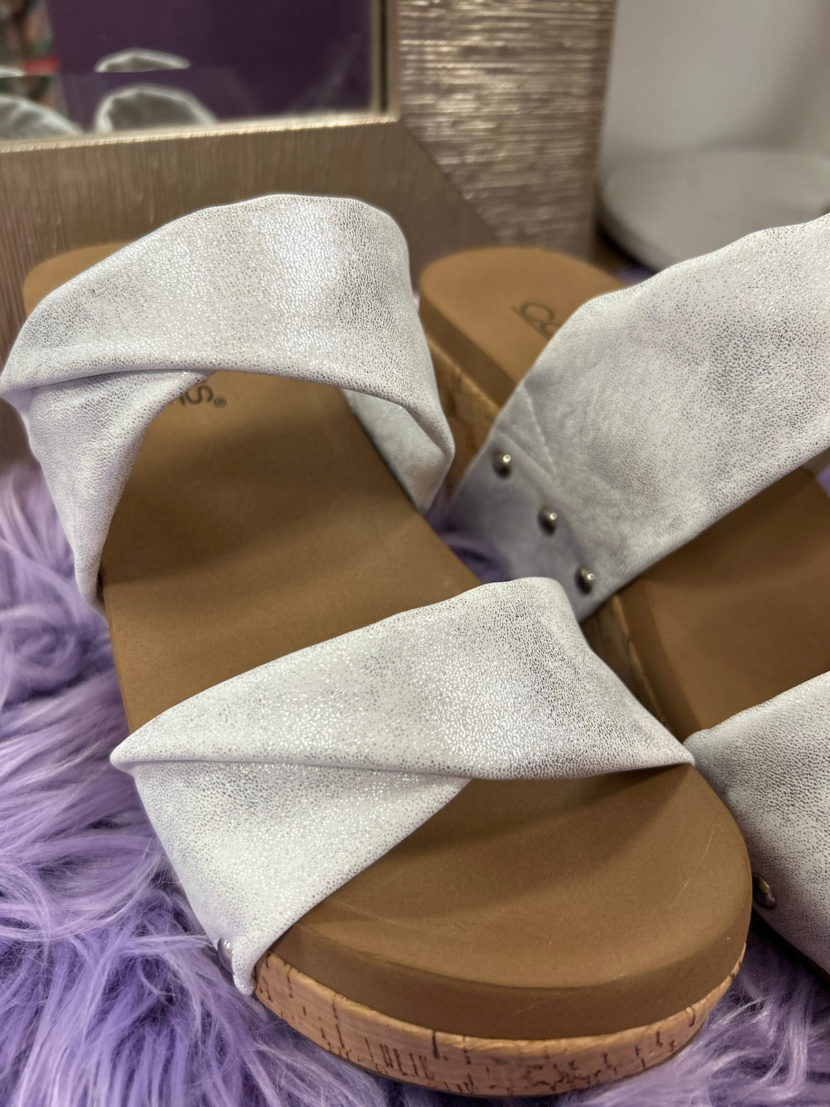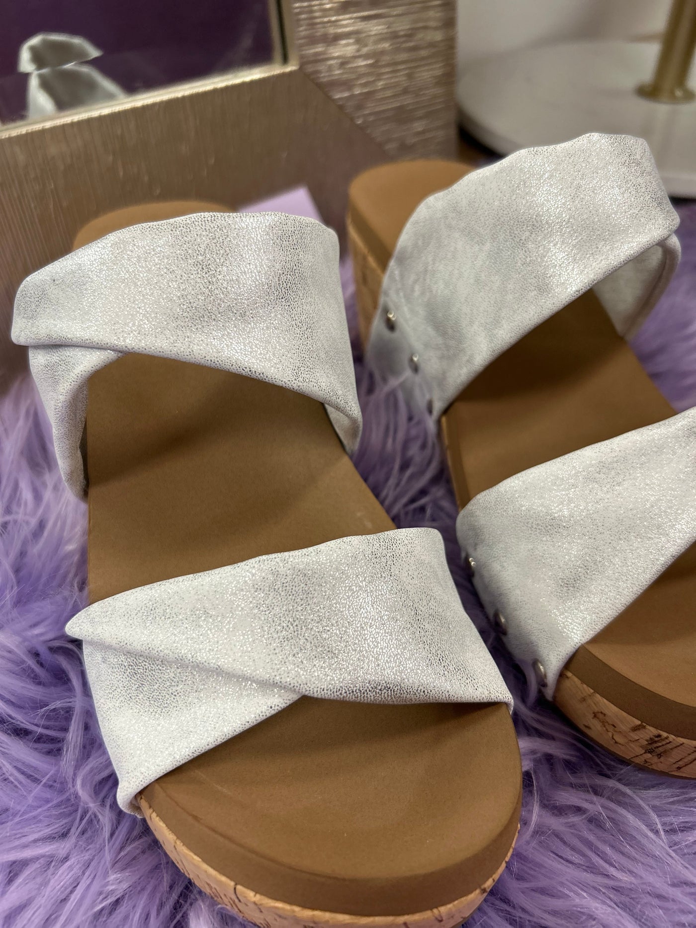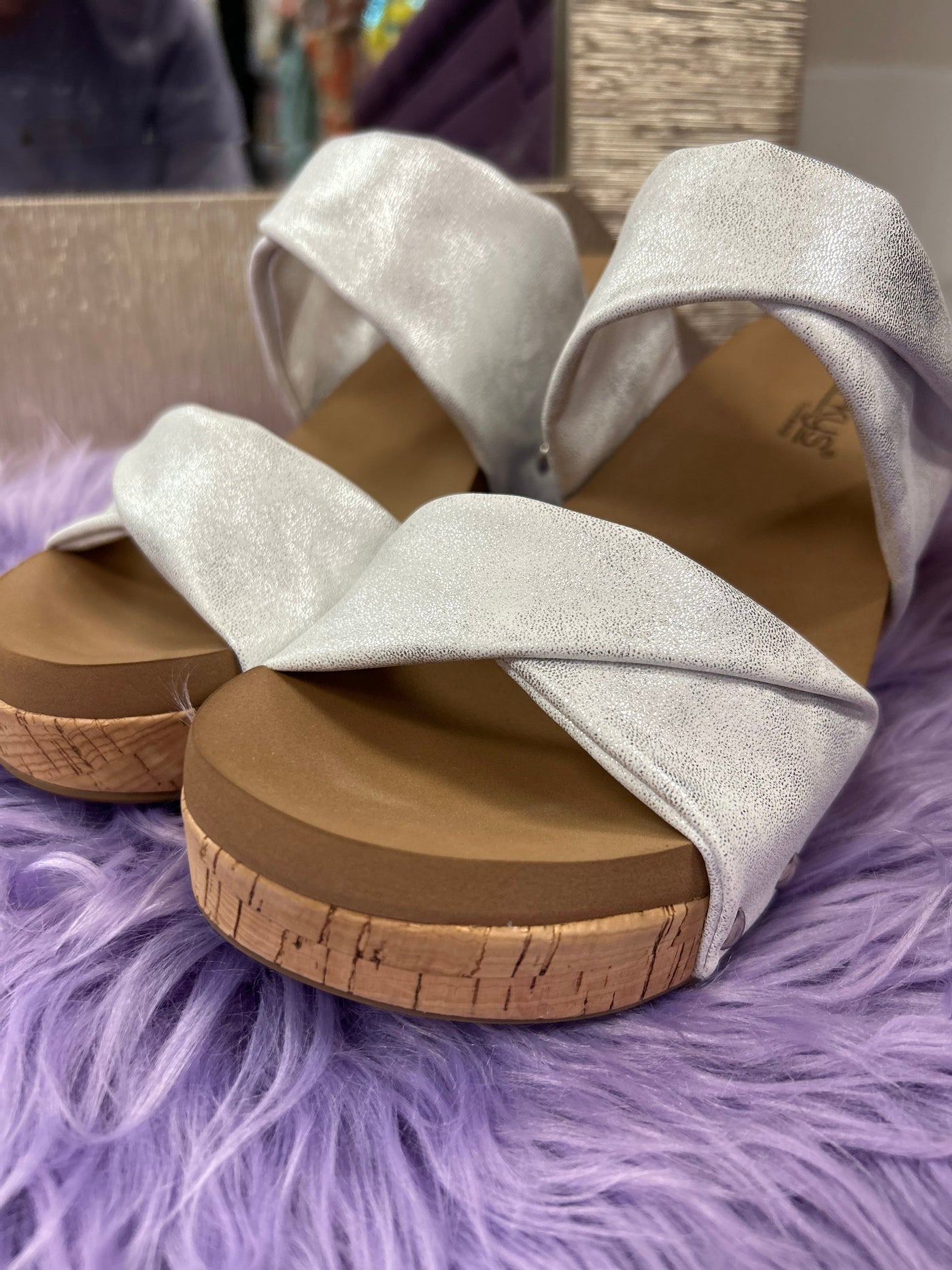 The Stranded Wedge by Corkys offers the ultimate comfort with its exclusive sole, perfect for all-day wear. Its twist detail on the straps adds a touch of uniqueness to its classy design. Available in white metallic, it adds just the right amount of sparkle to your wardrobe. Trust the best selling Corkys brand for a stylish and comfortable wedge.