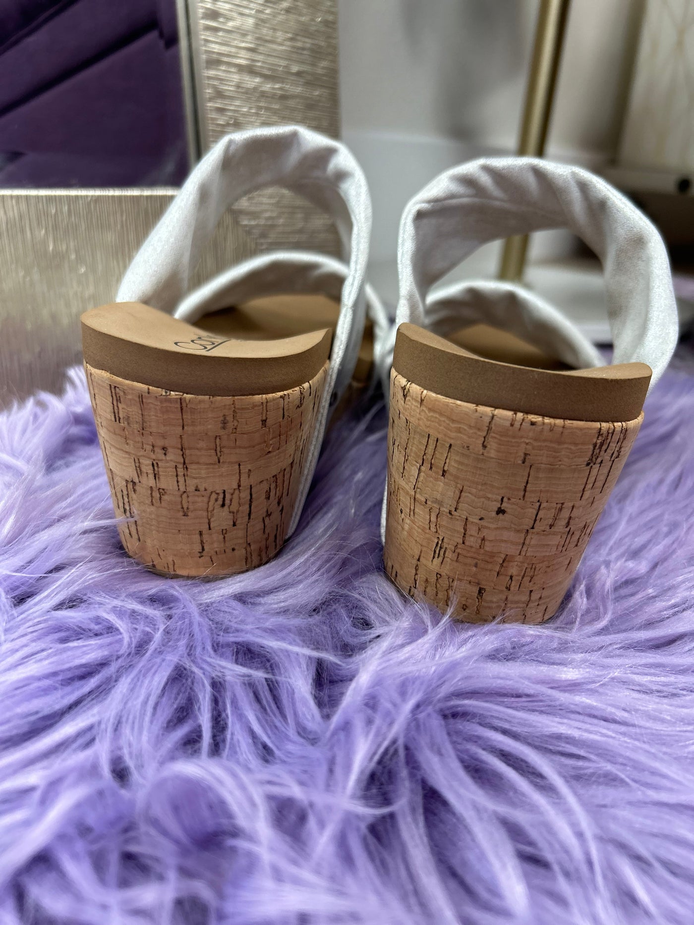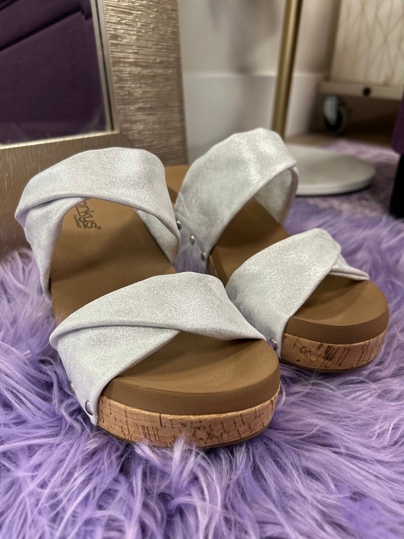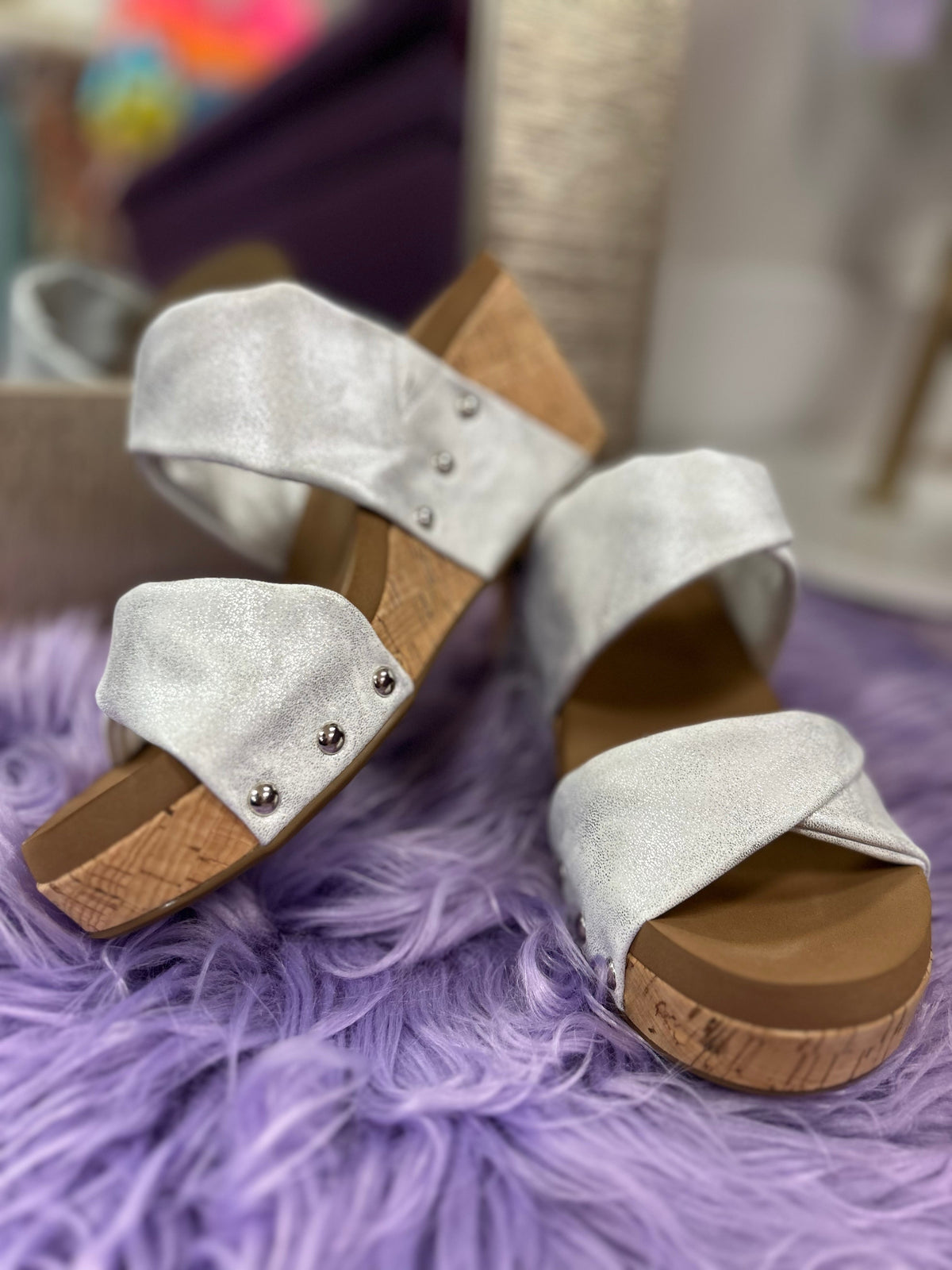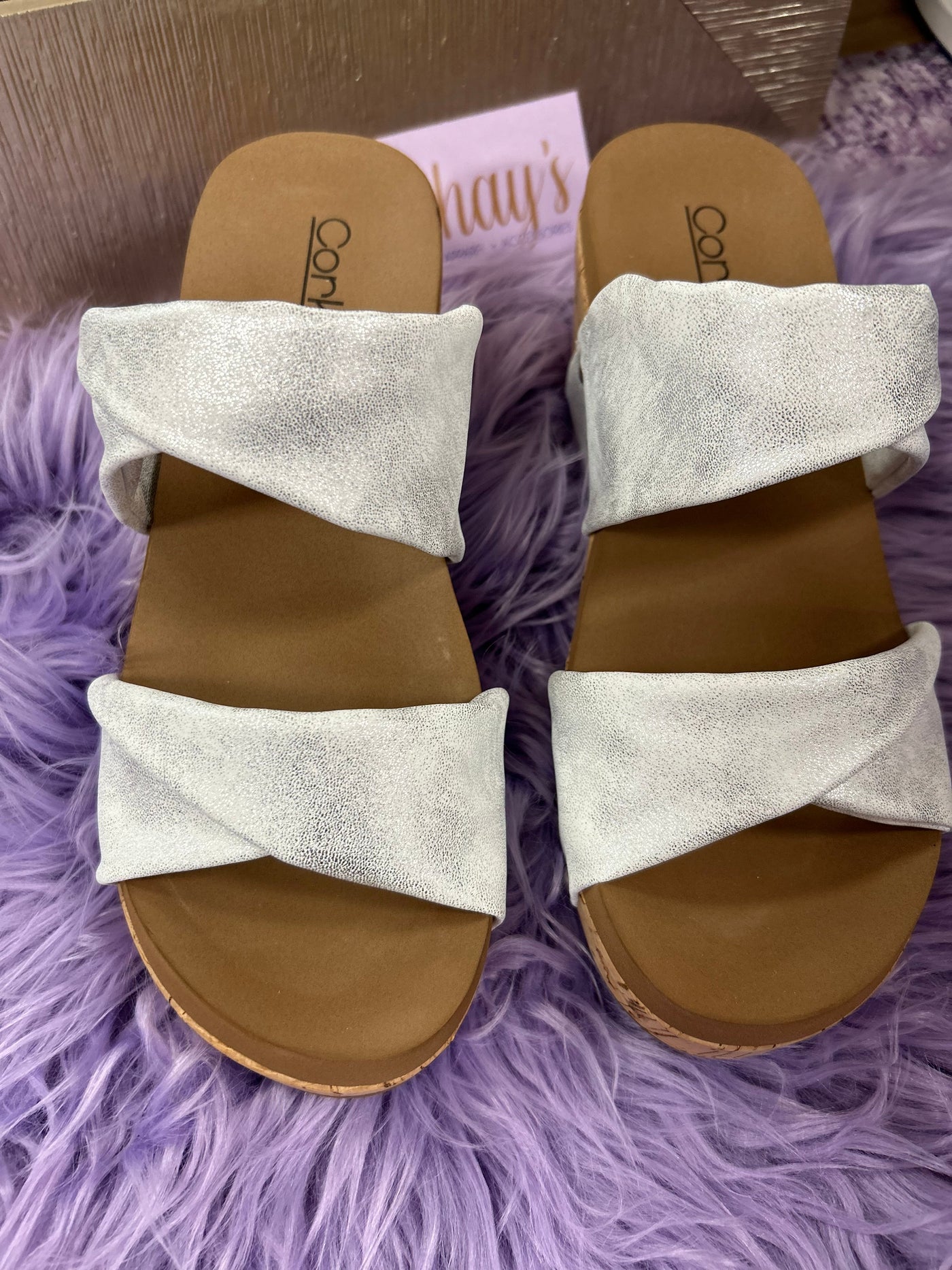 The Stranded Wedge by Corkys offers the ultimate comfort with its exclusive sole, perfect for all-day wear. Its twist detail on the straps adds a touch of uniqueness to its classy design. Available in white metallic, it adds just the right amount of sparkle to your wardrobe. Trust the best selling Corkys brand for a stylish and comfortable wedge.