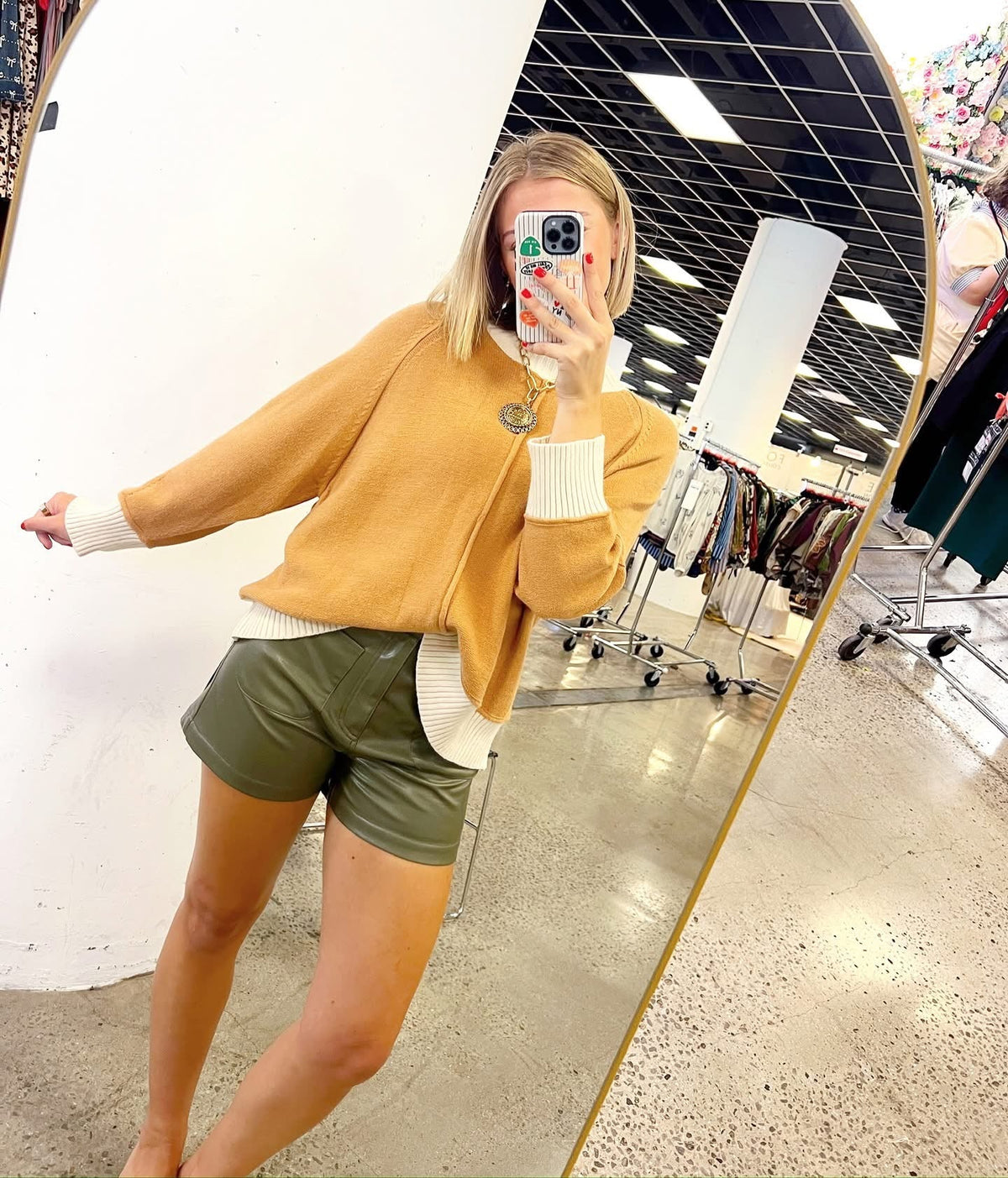 Solid sweater knit long sleeve pullover top featuring contrast accent band. Unlined. Knit. Non-sheer. Lightweight