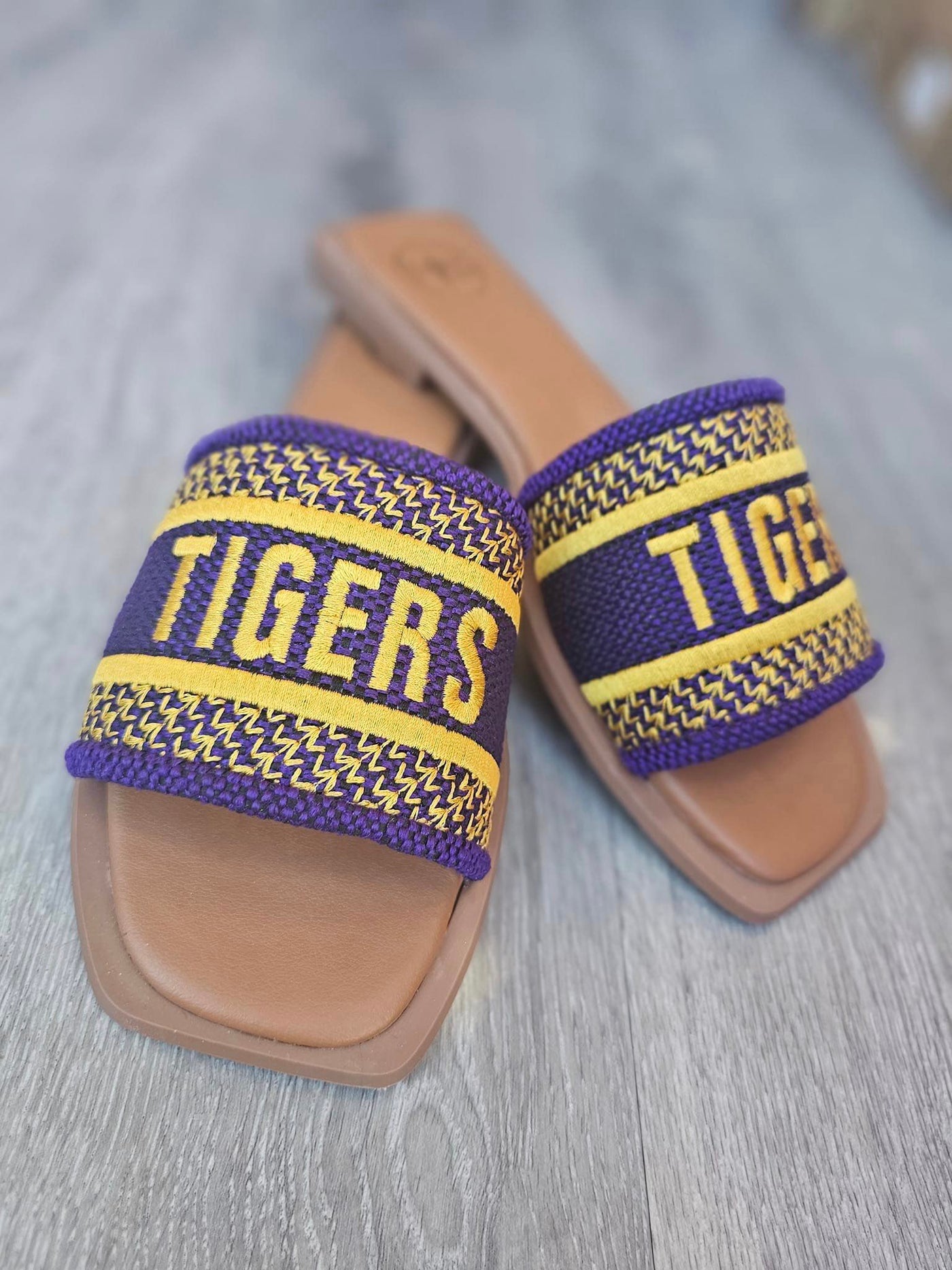 Stay comfortable and stylish this spring with "Tigers" purple and gold sandal. The simple silhouette and square toe make it perfect for game day, while the wide strap features the name of our favorite team. As an industry expert, I recommend these sandals for all day wear, providing both comfort and a way to show support for your team. No need to blend in with the crowd - stand out with our team-inspired sandals.