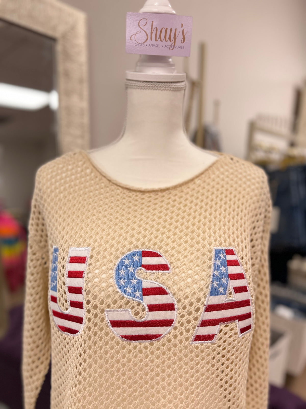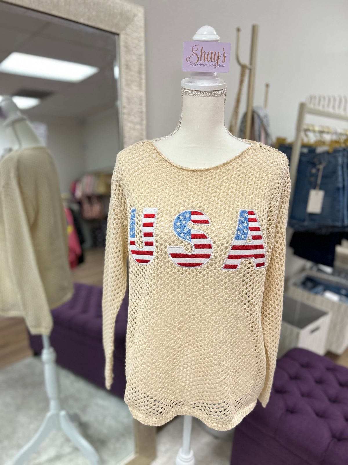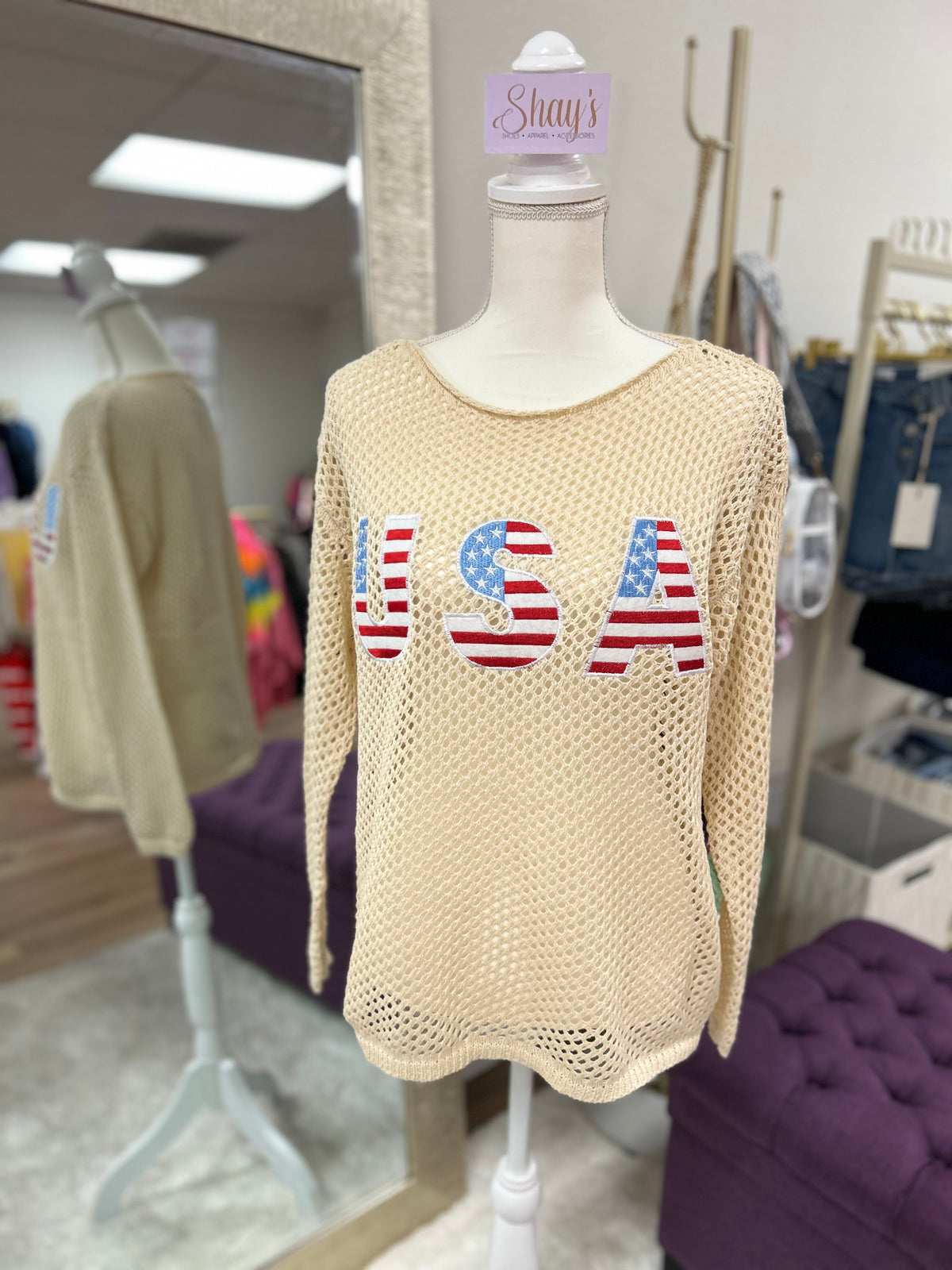 USA Flag Letter Open Knit Top - Small / Oatmeal