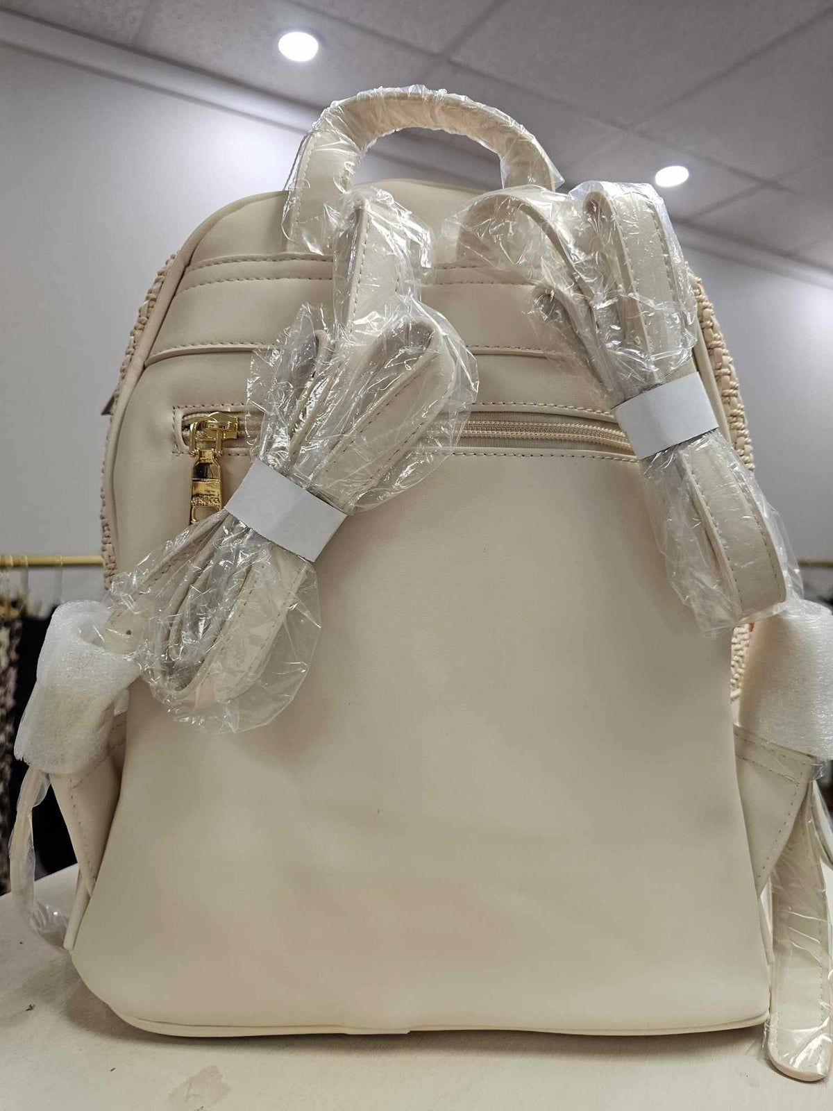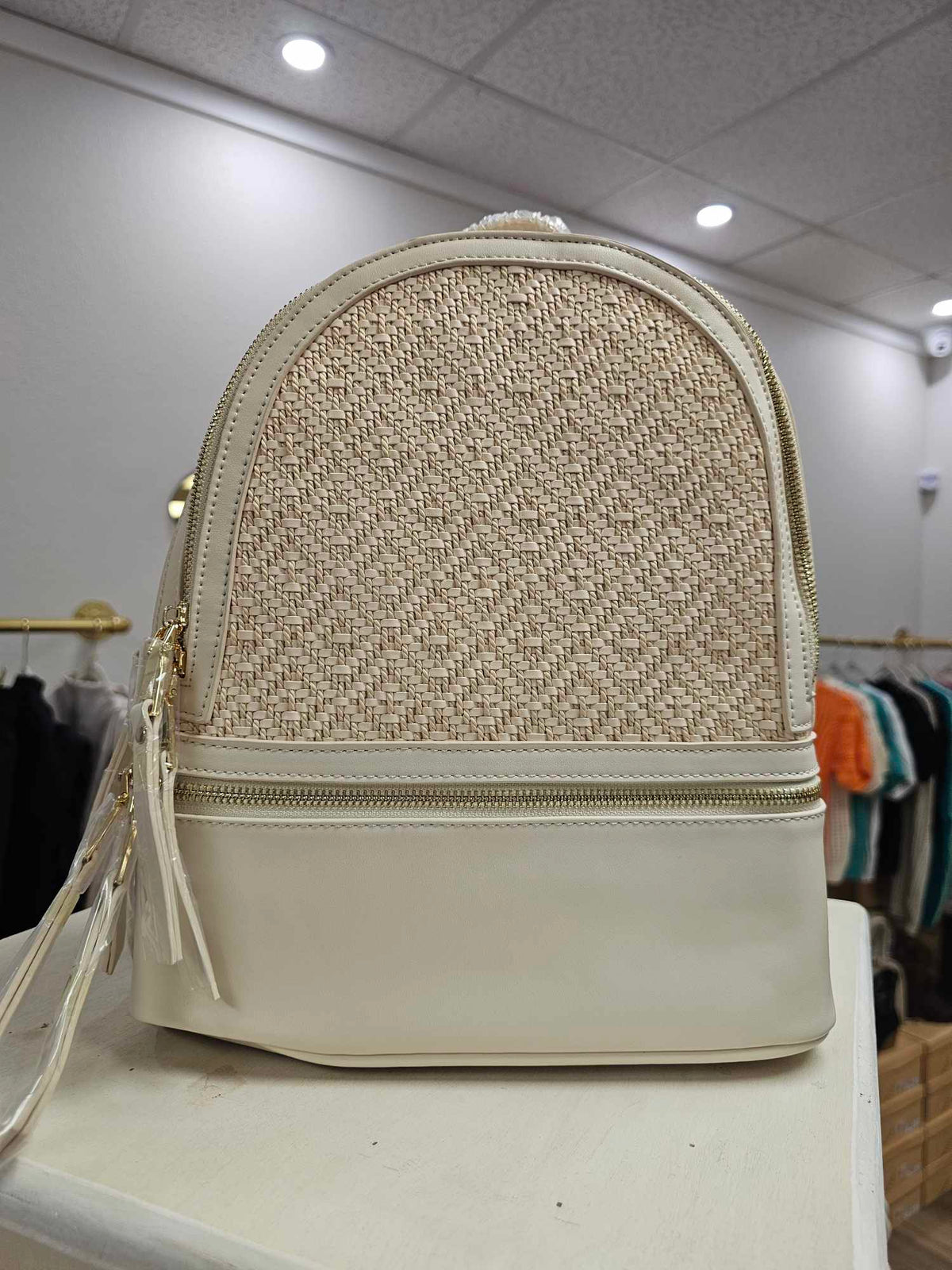 This Zaharia backpack boasts a classy, neutral color design and a woven pattern, making it a stylish yet functional accessory. Its spacious interior provides ample room for all your essentials. Perfect for everyday use or travel.