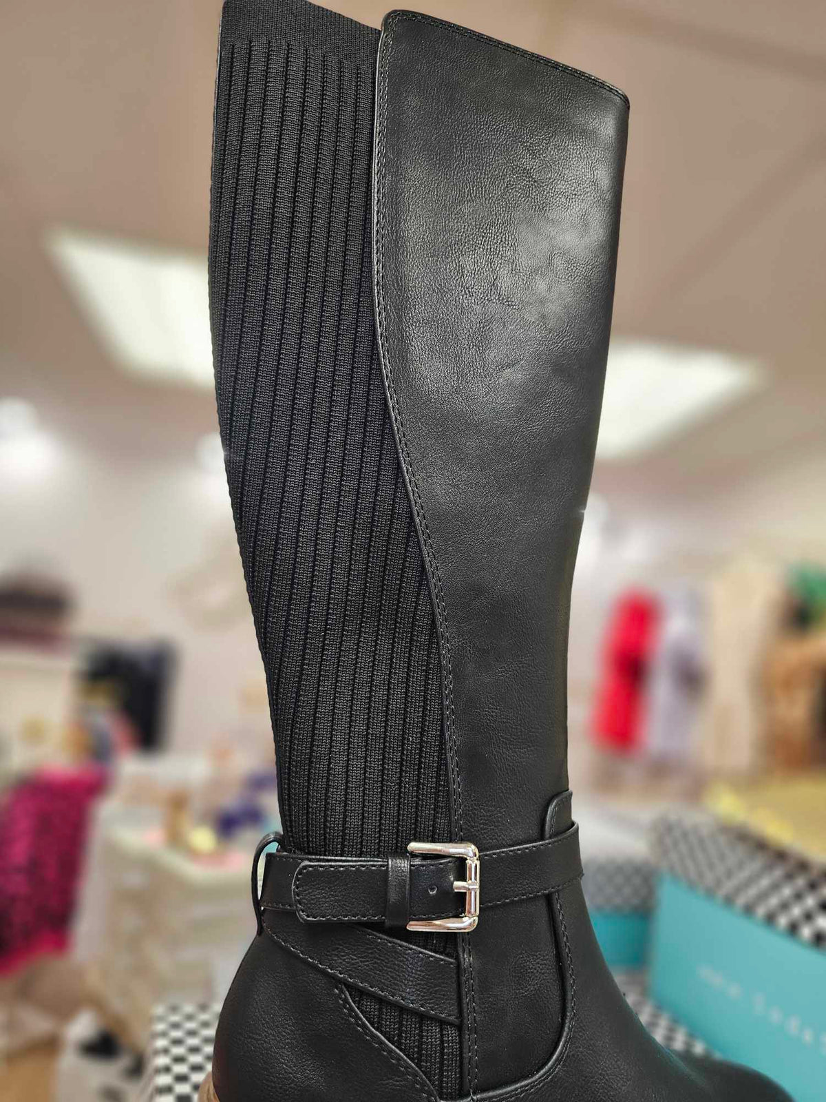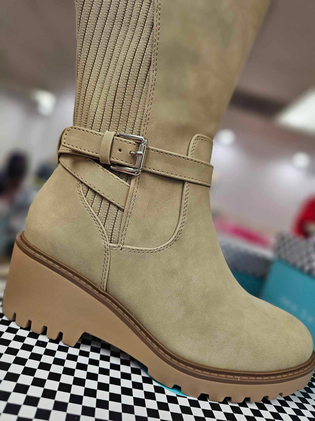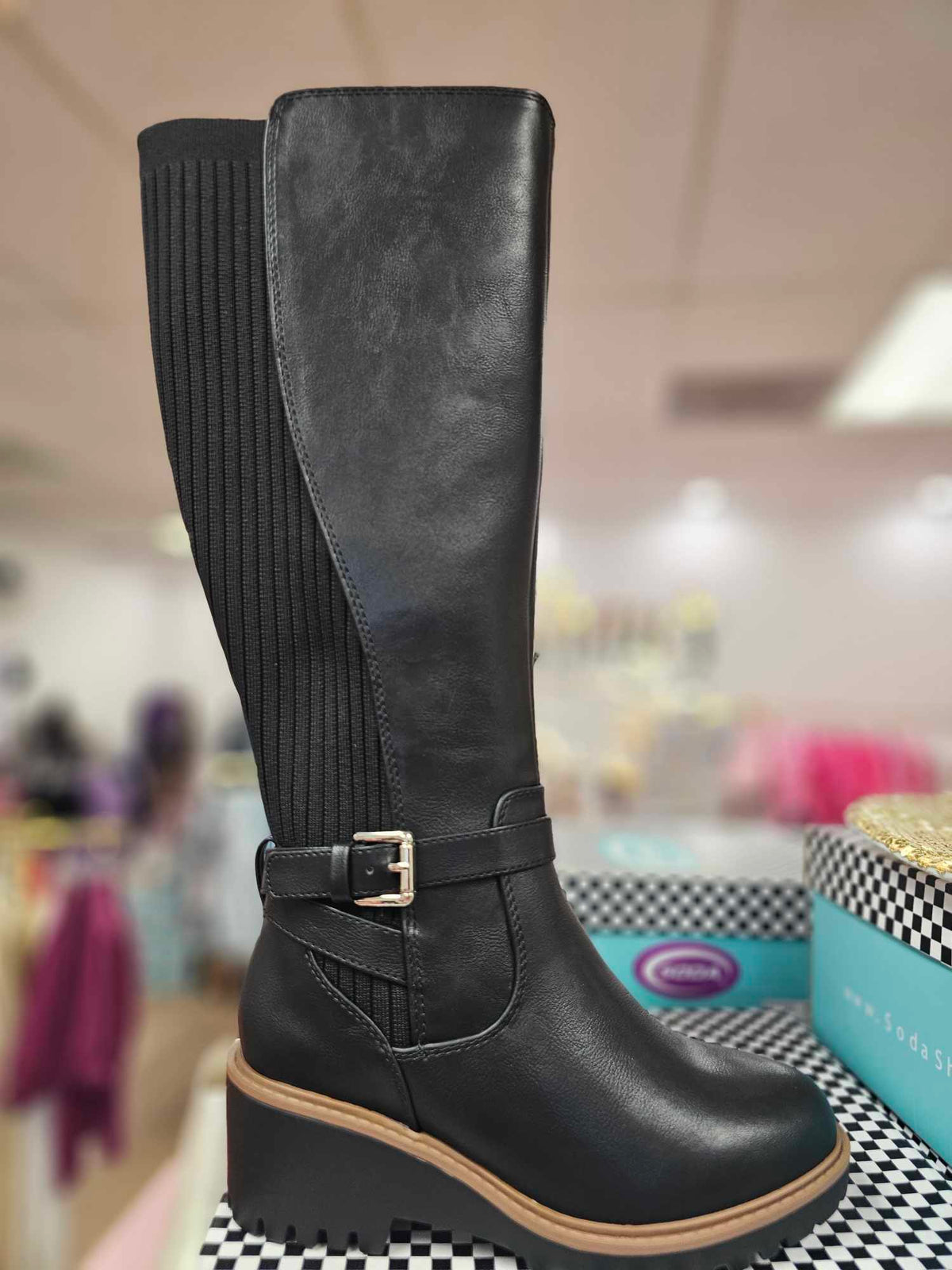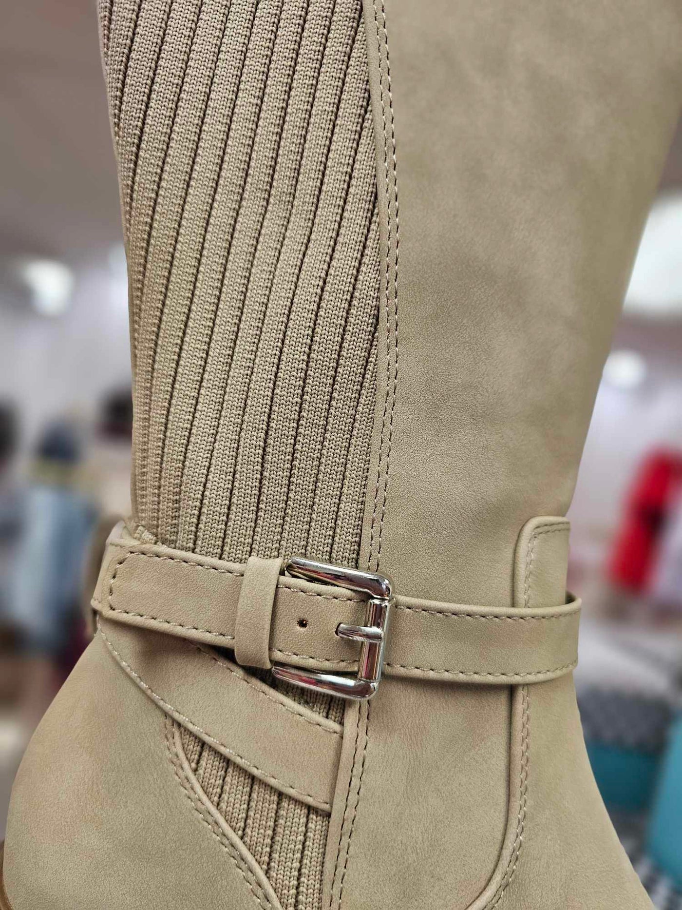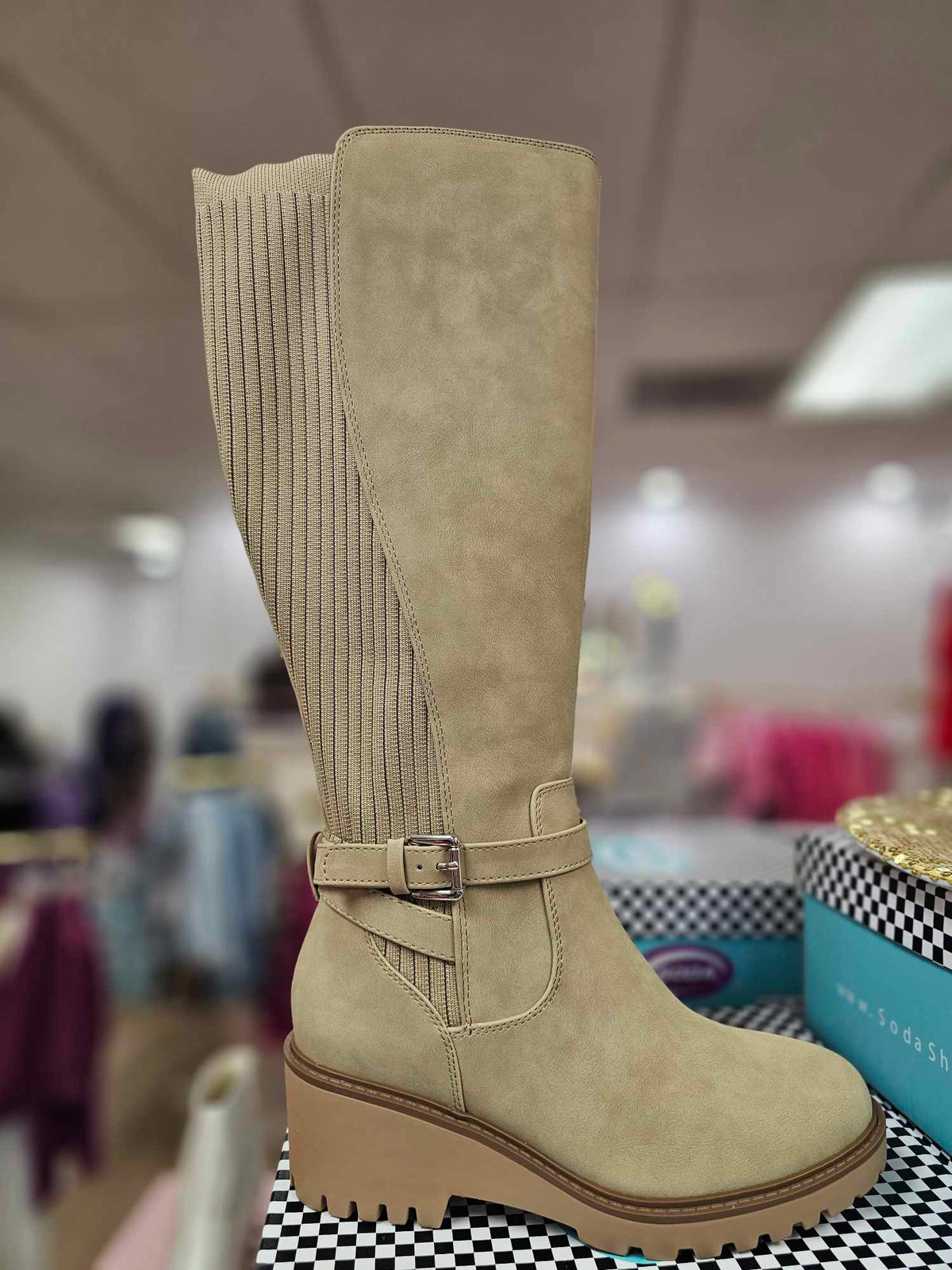 Elevate your style with our Zone Sweater Panel Riding Boot. The perfect balance of sophistication and coziness, this tall riding boot features a small wedge heel for added trendiness. A must-have essential in your wardrobe, available in multiple colors. Inside zipper for easy on/off